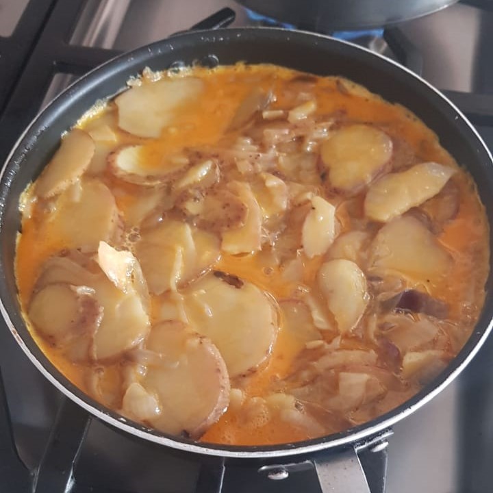 - En fuego bajo cocinar las papas y la cebolla, revolviendo eventualmente para que la cocción sea pareja. El objetivo es cocinar las papas y la cebolla, no fritarlas. No se preocupe por la cantidad de cebolla, después de la cocción quedara el sabor agradable y dulzón de la cebolla. Tampoco se preocupe por la cantidad de aceite.