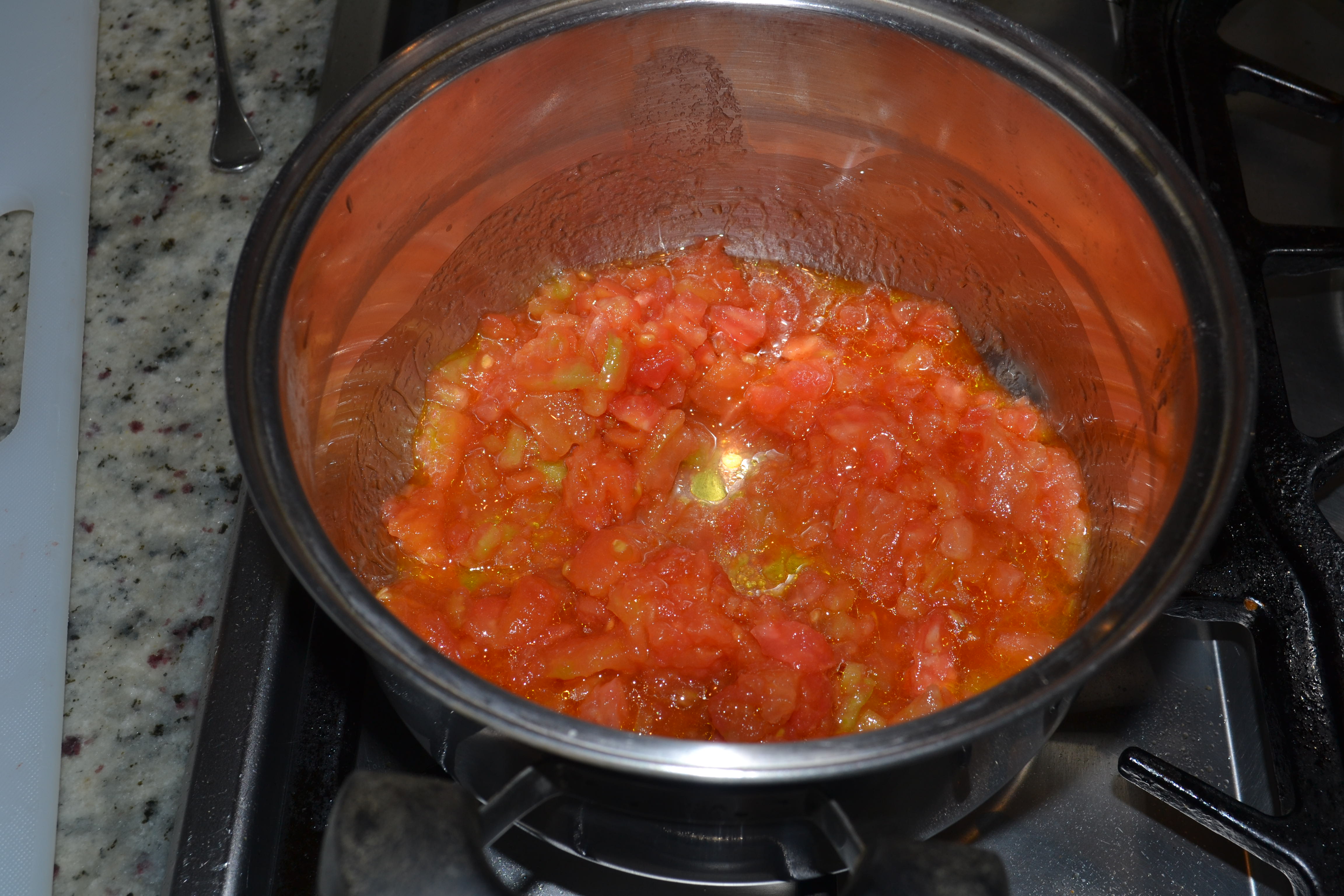 - En una olla mediana o sartén profundo cocinar a fuego medio por 5 minutos la pulpa de los tomates con sal y pimienta y dos cucharadas de aceite de oliva.