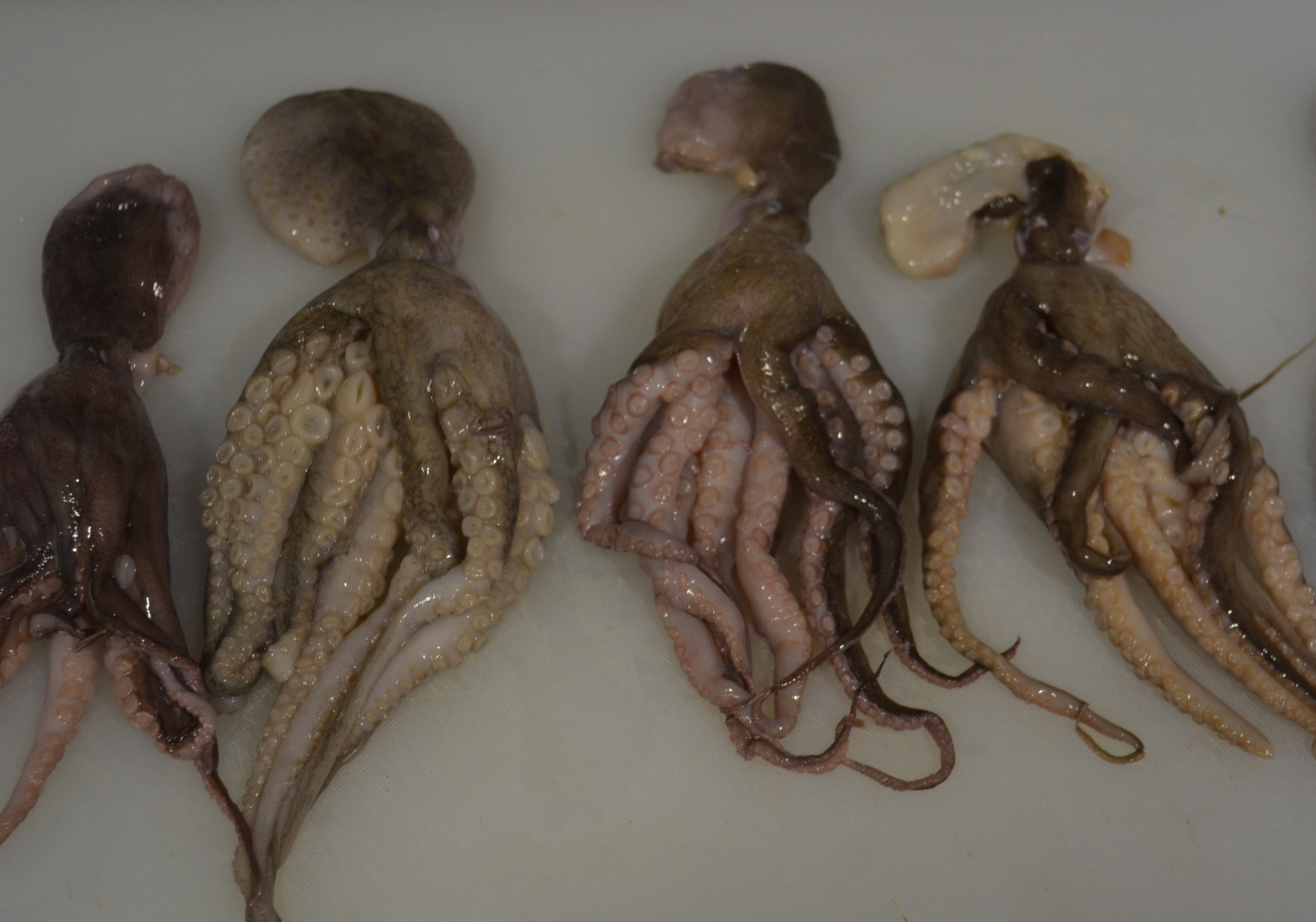 - Limpiar los pulpitos cortando la cabeza por debajo de los ojos de tal forma que quede solo la corona de tentáculos y la boca del pulpo no quede en la corona (debe quedar un orificio central en la corona). La cabeza y la boca son desechadas.