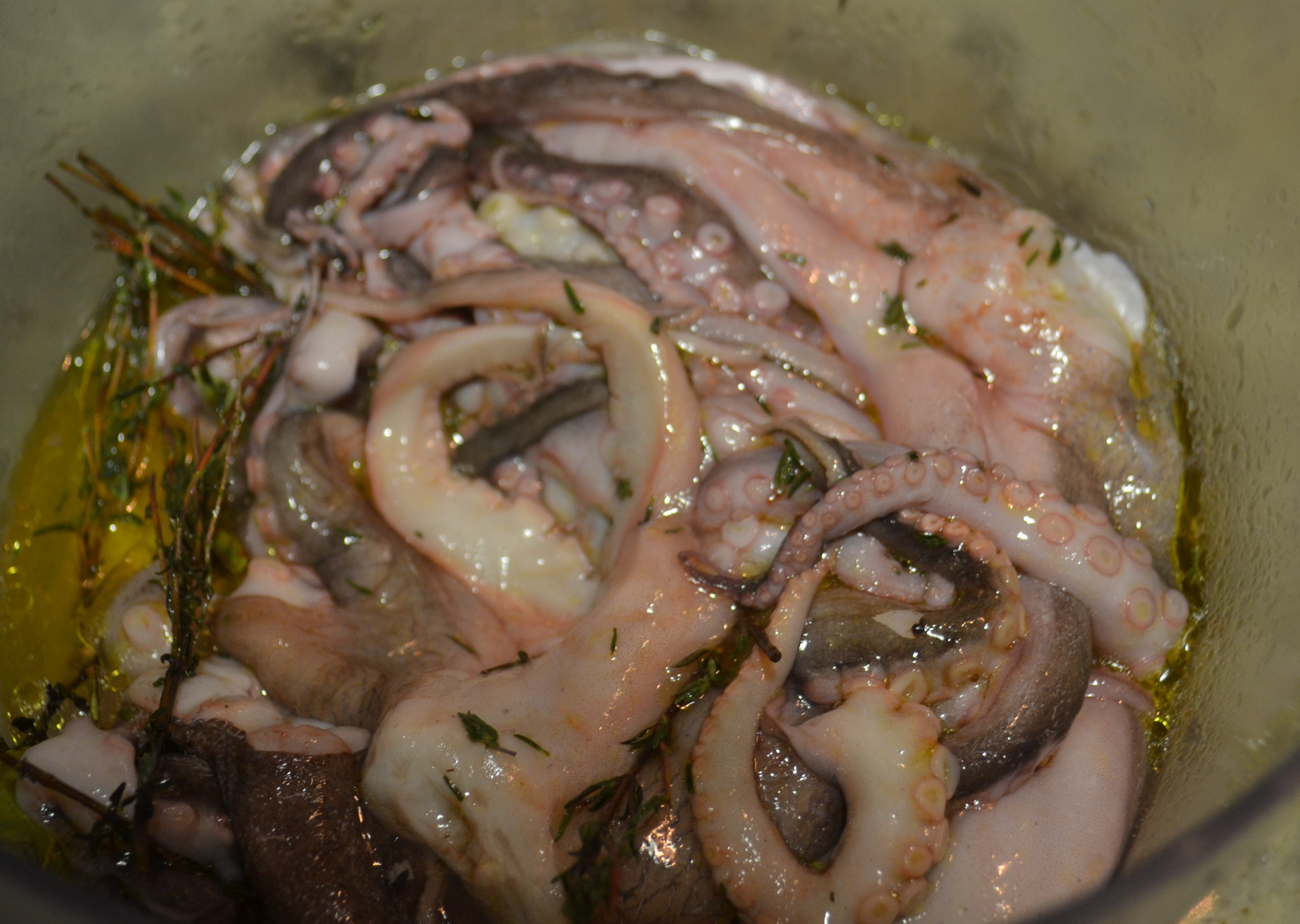 - En un recipiente colocar los pulpitos, el aceite de oliva, el jugo del limón, las cascaras del limón exprimido, las hojas de laurel y tomillo, dos pizcas de sal y pimienta. Cerrar el recipiente y conservar en la nevera por lo menos 6 horas, mejor si puede dejarlos marinando toda la noche.