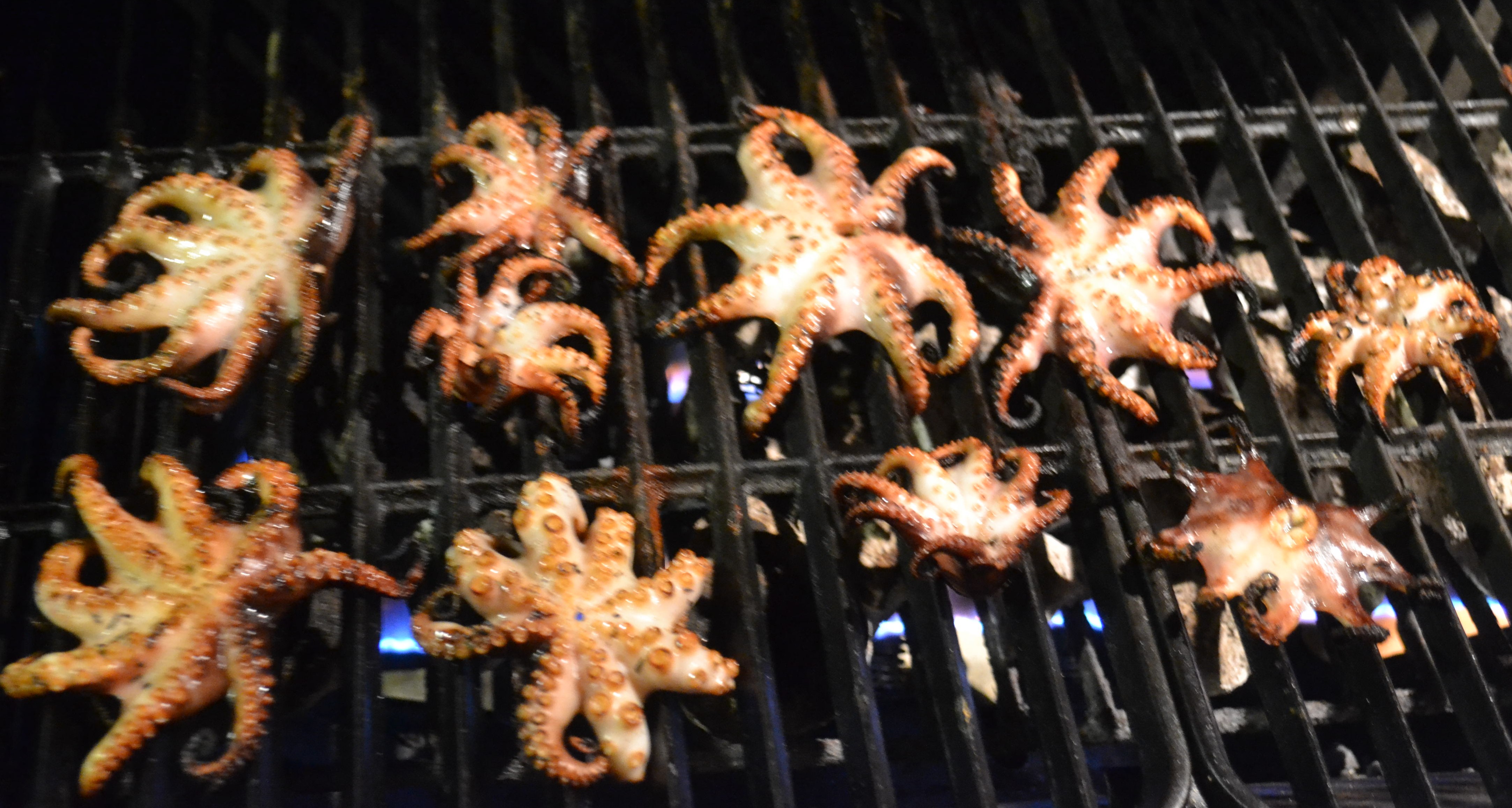 - Para asarlos, el asador debe estar muy caliente; colocar directamente en la parrilla las coronas de pulpitos, voltear las coronas cada minuto o minuto y medio hasta que estén tostadas las puntas de los tentáculos.