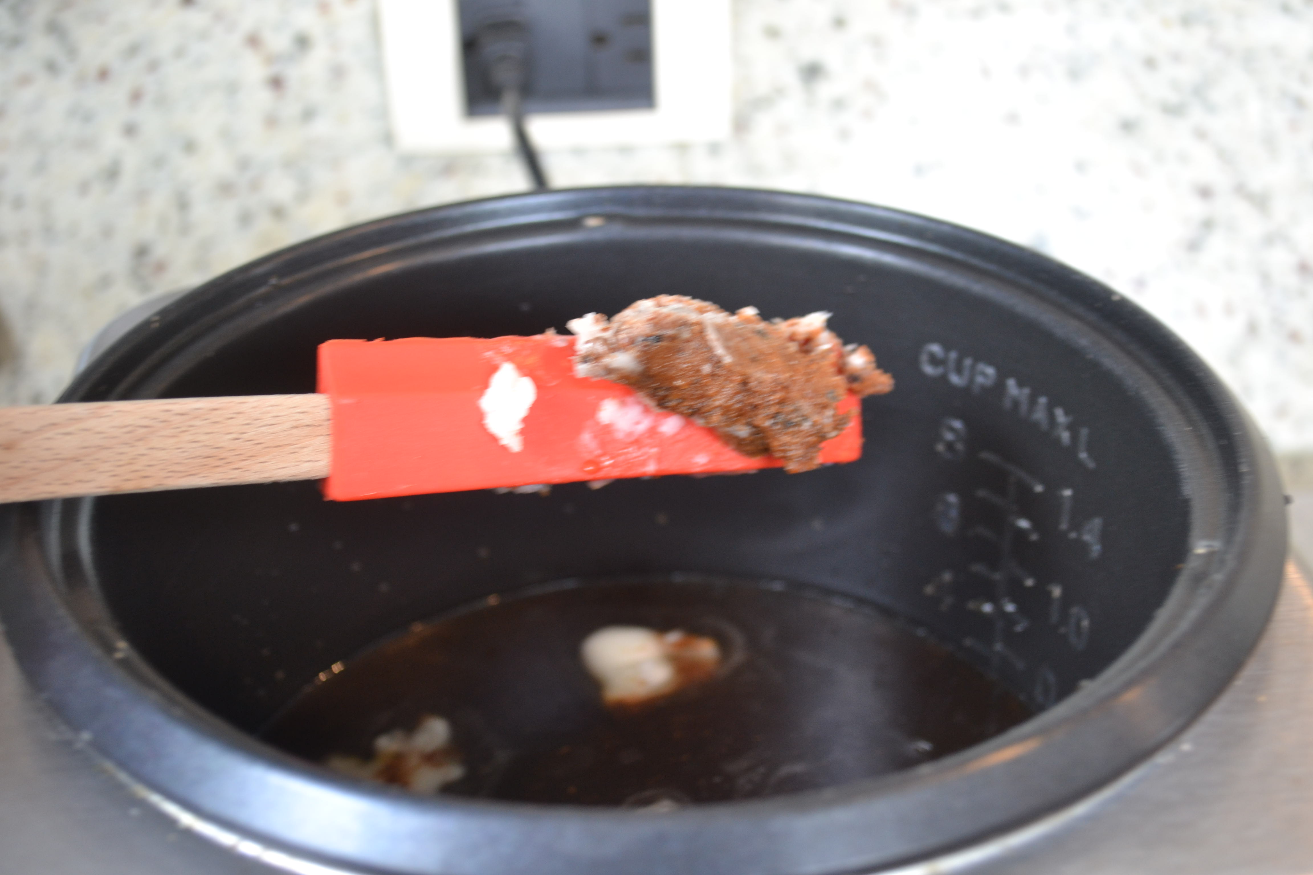 - En la olla del arroz agregue el agua, la coca cola. la tintura de panela, sal y azúcar.