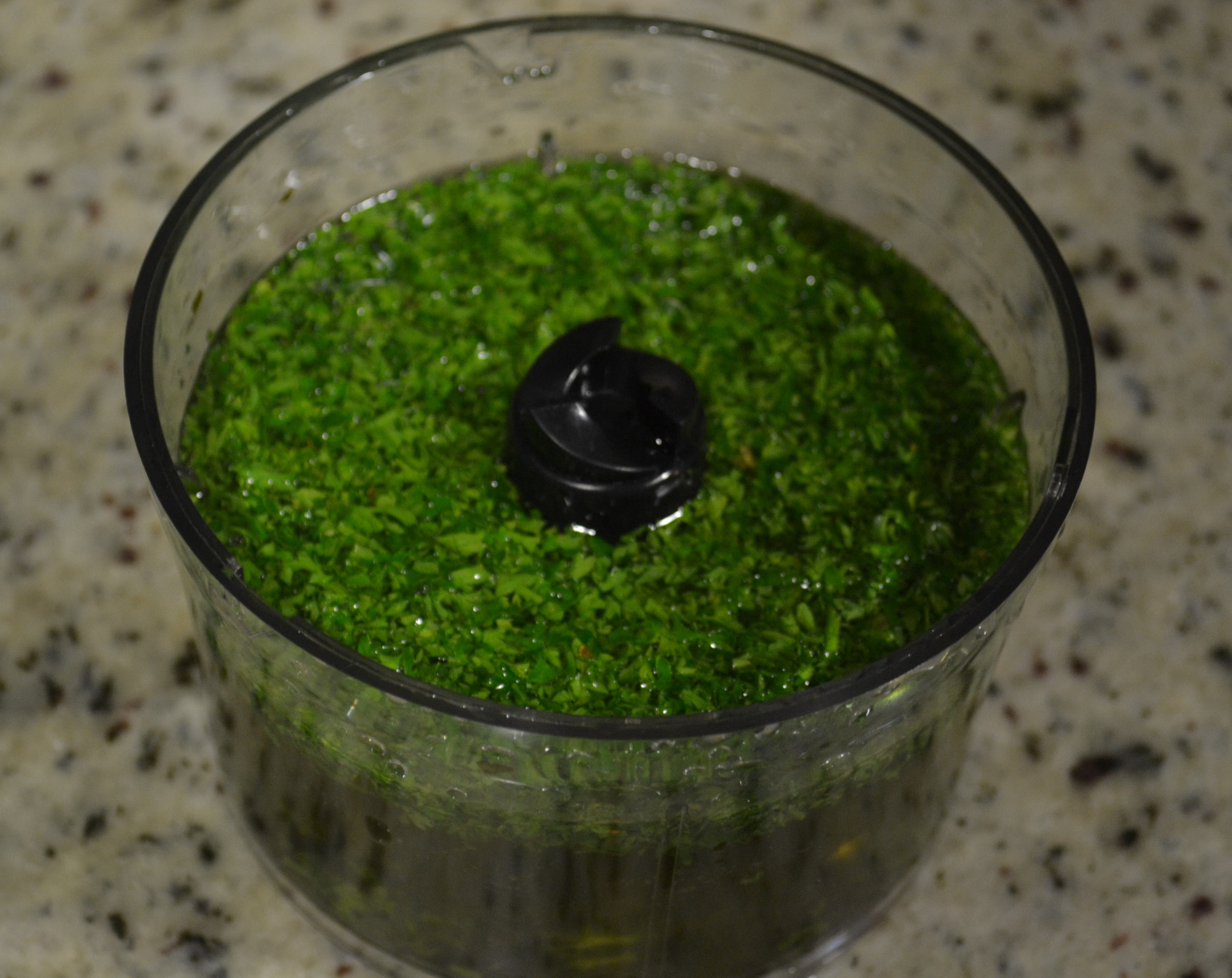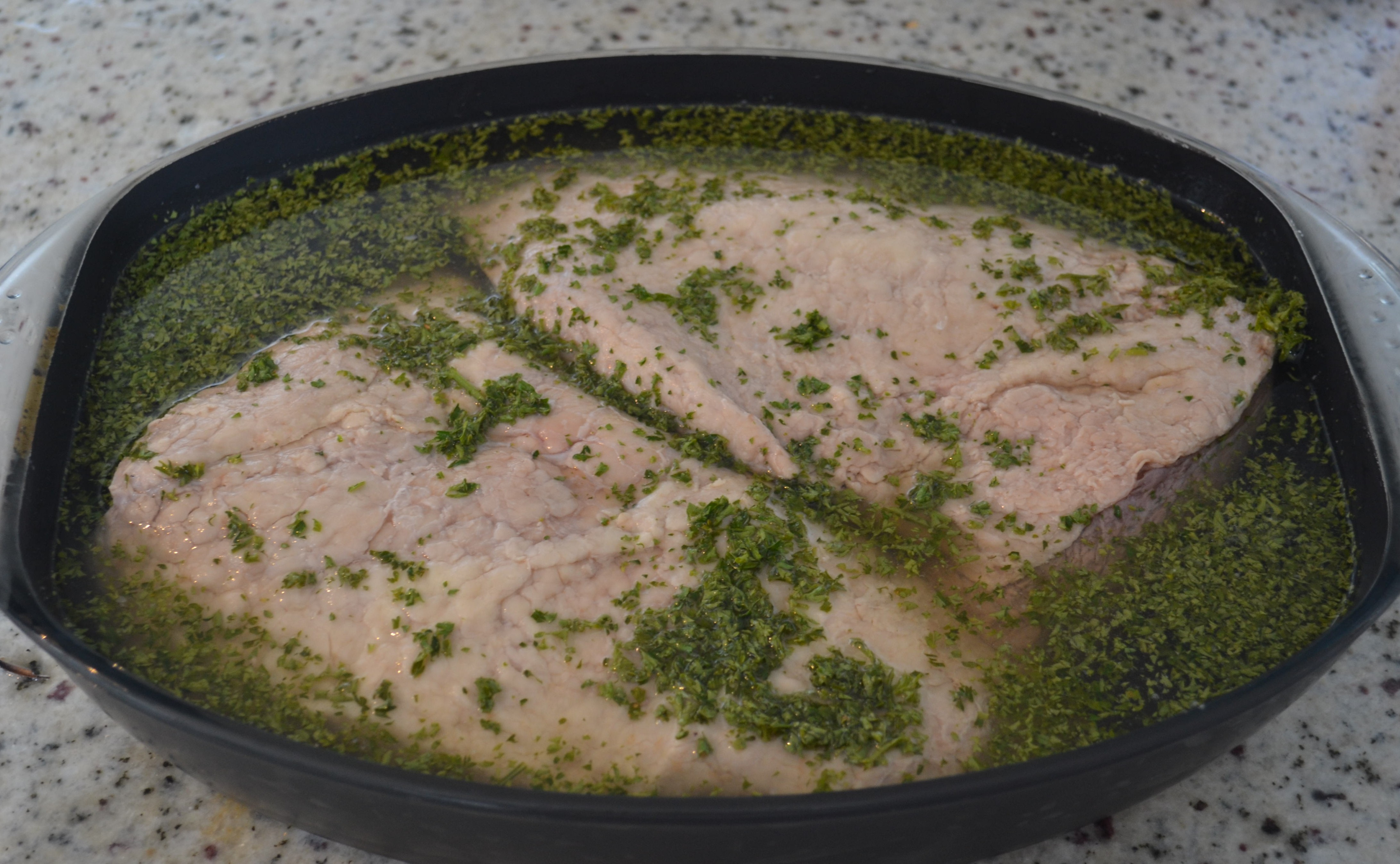 - Colocar la carne en un recipiente hondo que la contenga totalmente y añadir el vinagre y el vino con el perejil procesado. Tapar con papel film y conservar en la nevera por 6 horas mínimo.