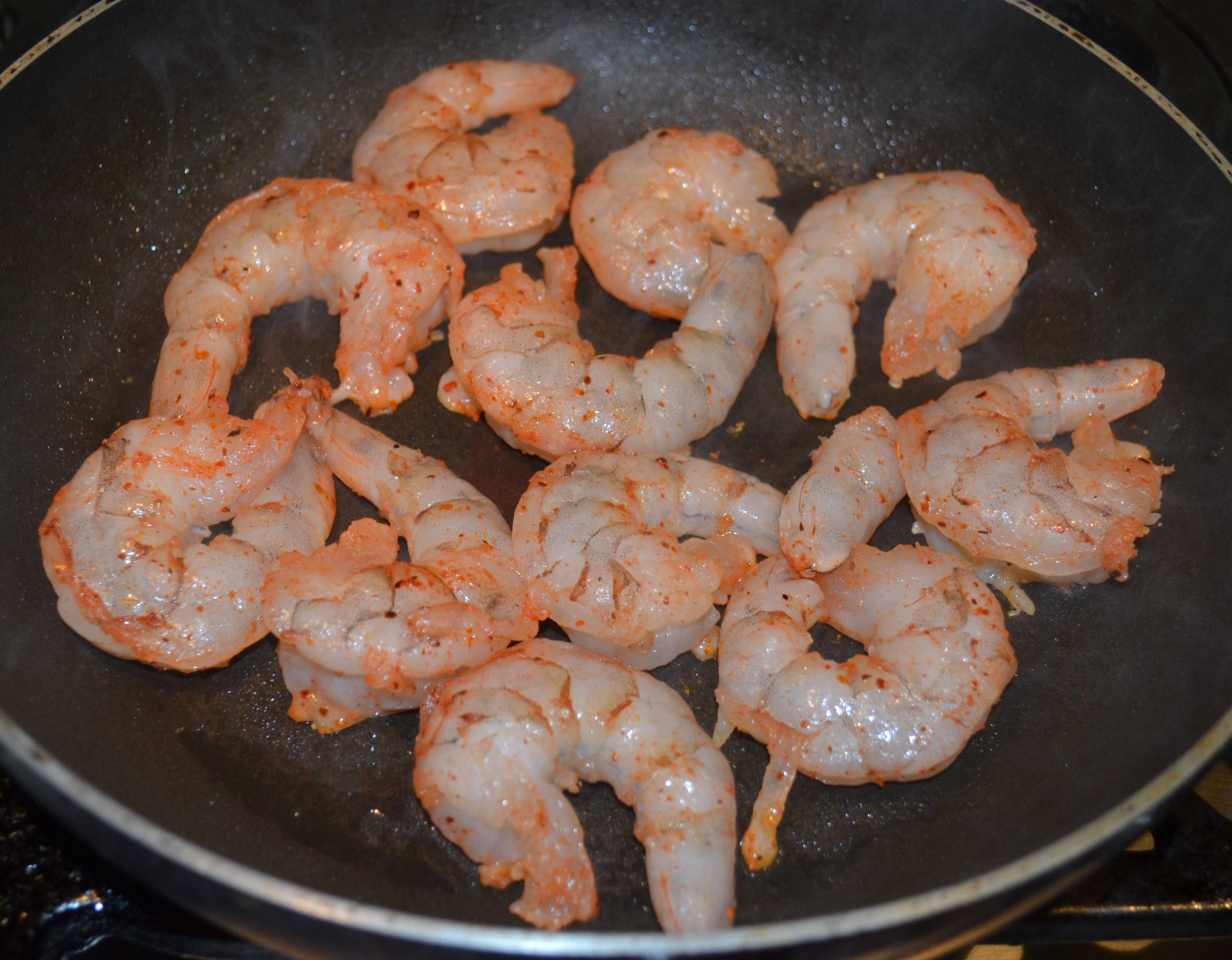 - Agregue los langostinos volteándolos constantemente por 4 o 5 minutos. El punto se consigue cuando los langostinos están rosados por todos los lados.