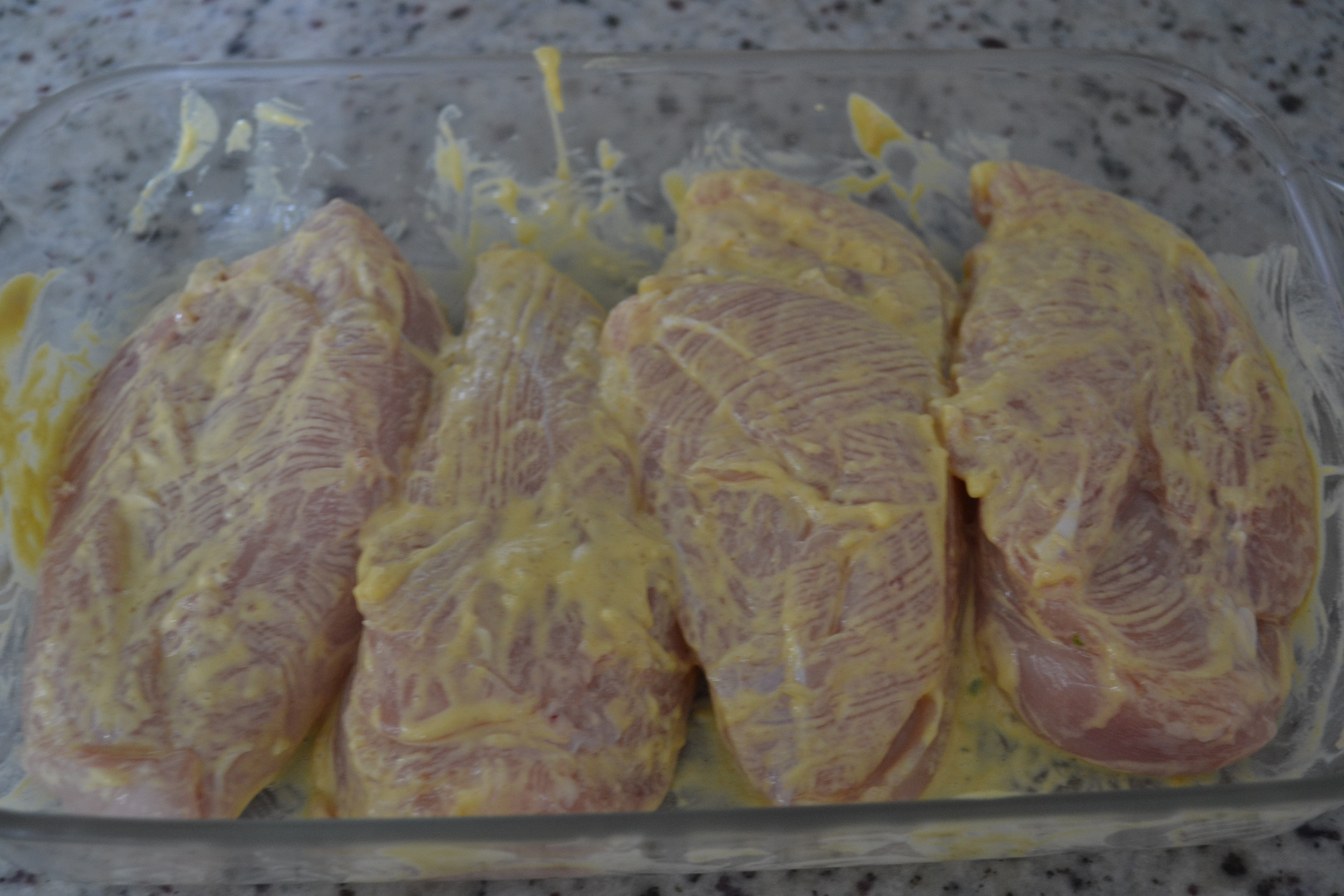- Embadurnar la mezcla de la mostaza a las pechugas.