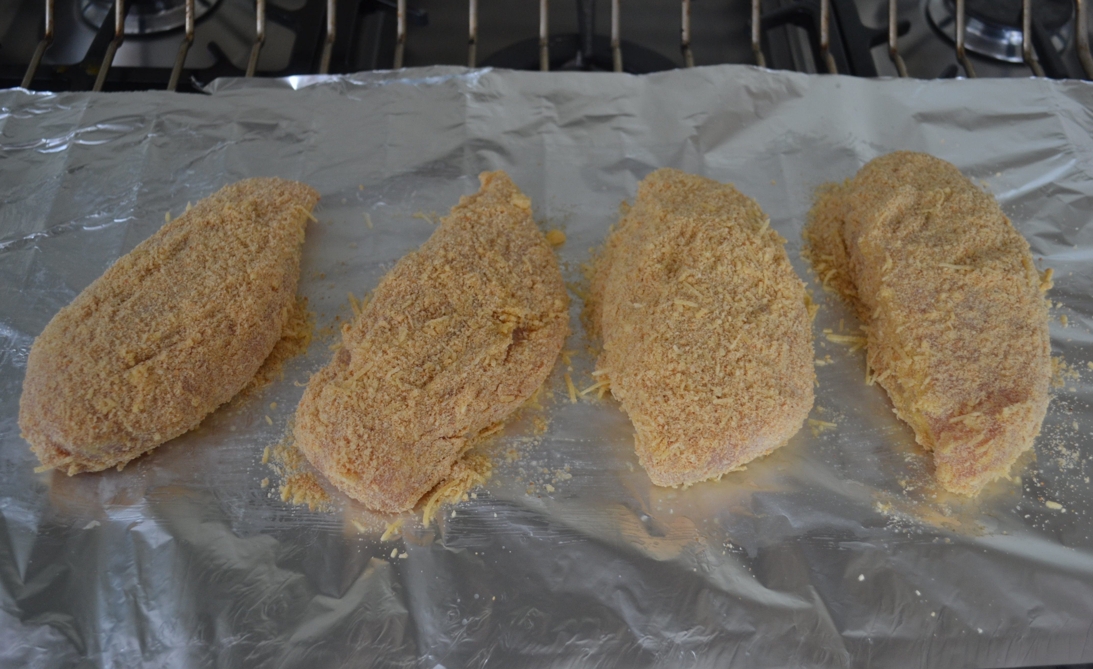 - Pasar las pechugas por la mezcla de queso y miga hasta que estén completamente cubiertas.