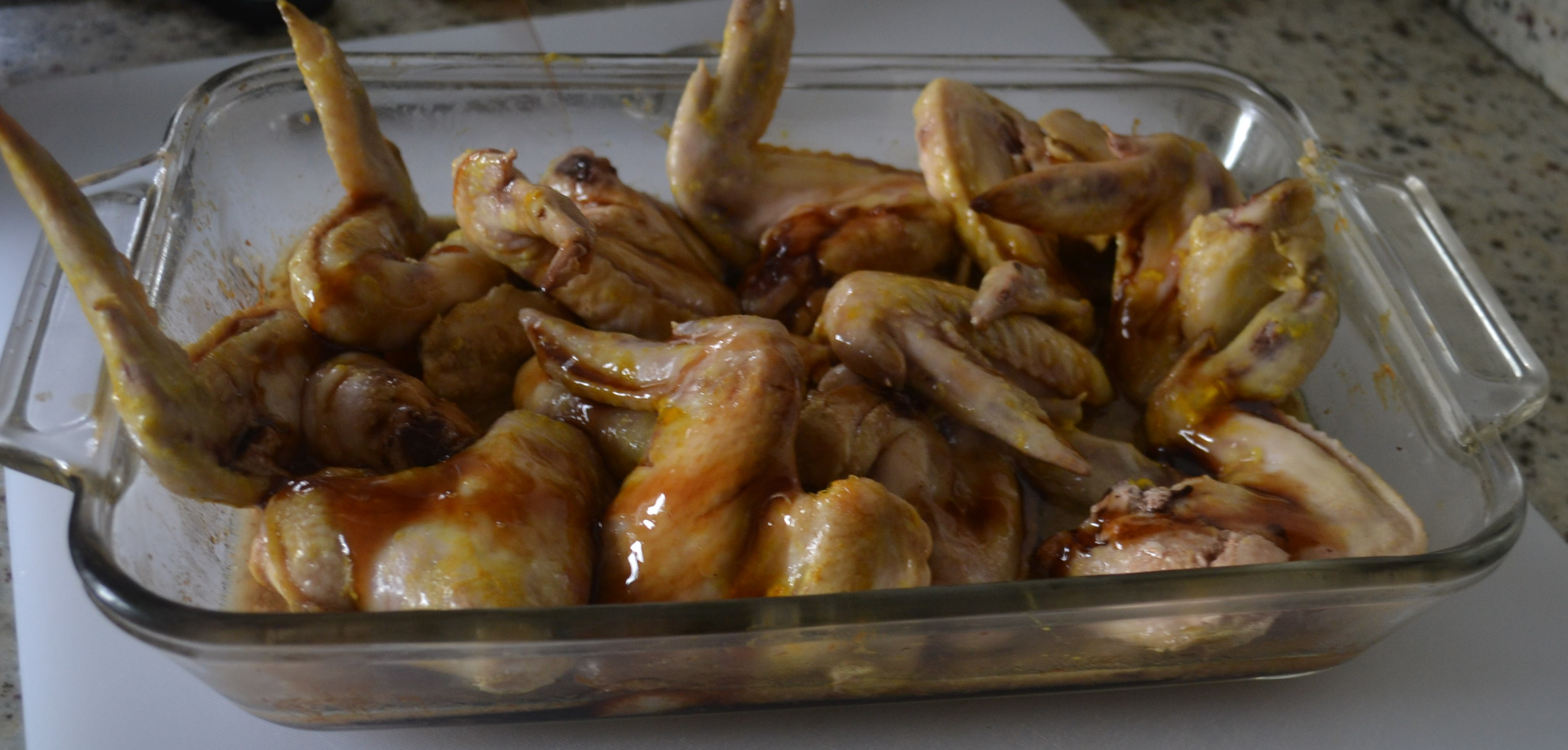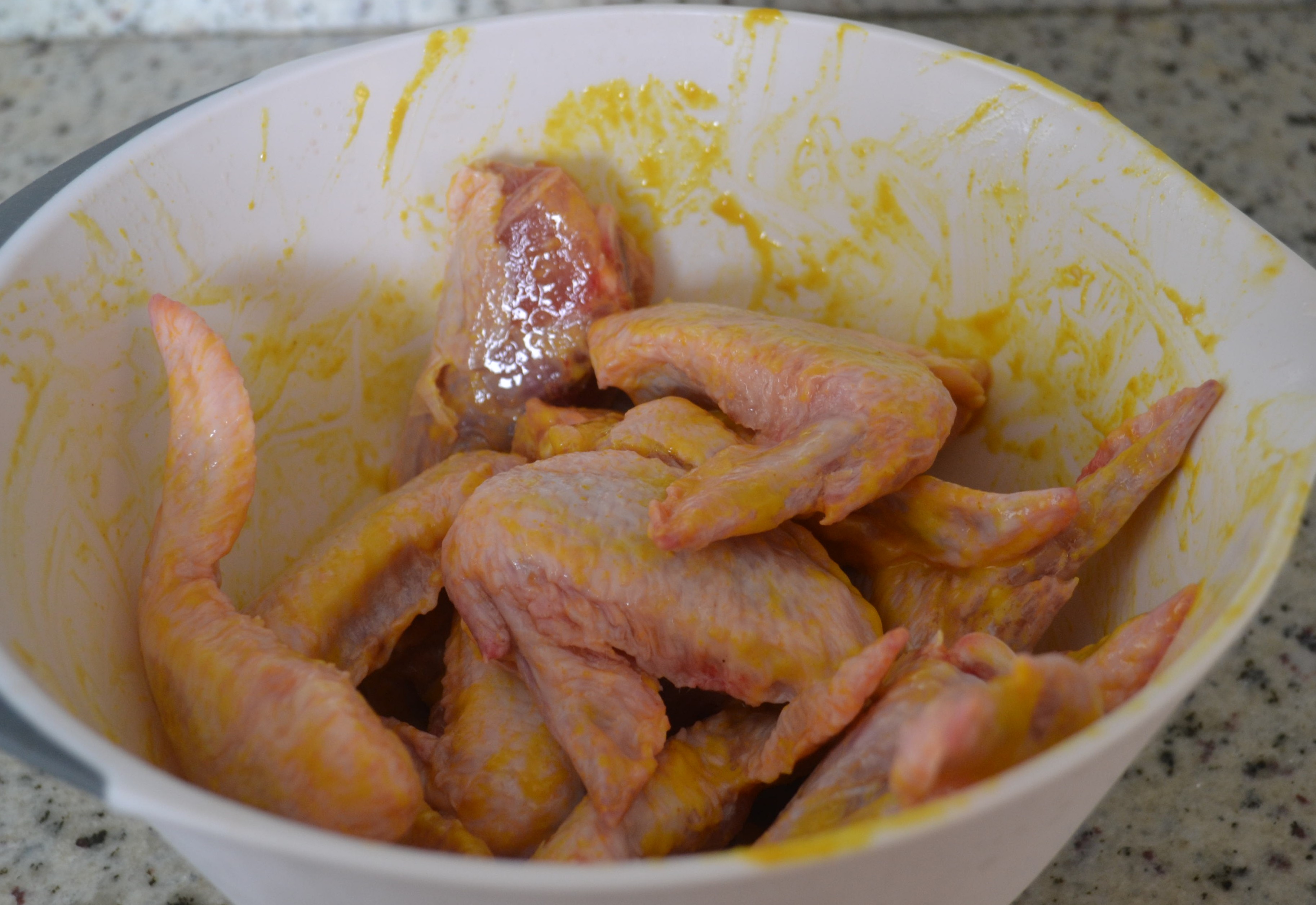 - Salpimiente las alitas y úntelas con la mostaza y la mantequilla.