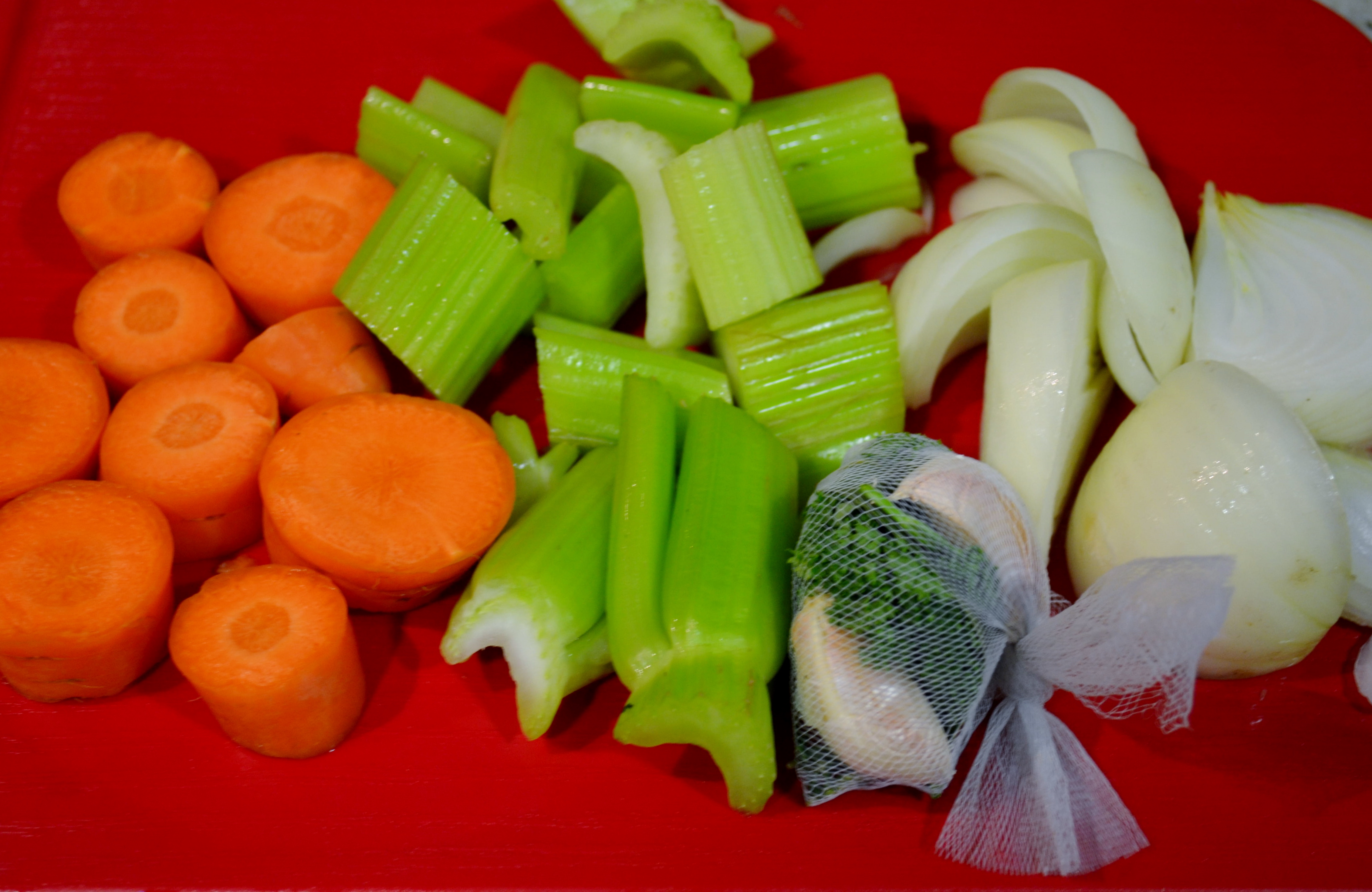 1. Cortar las verduras en pedazos grandes, agregando 1/2 taza de cada una por cada cuarto de libra de pollo.