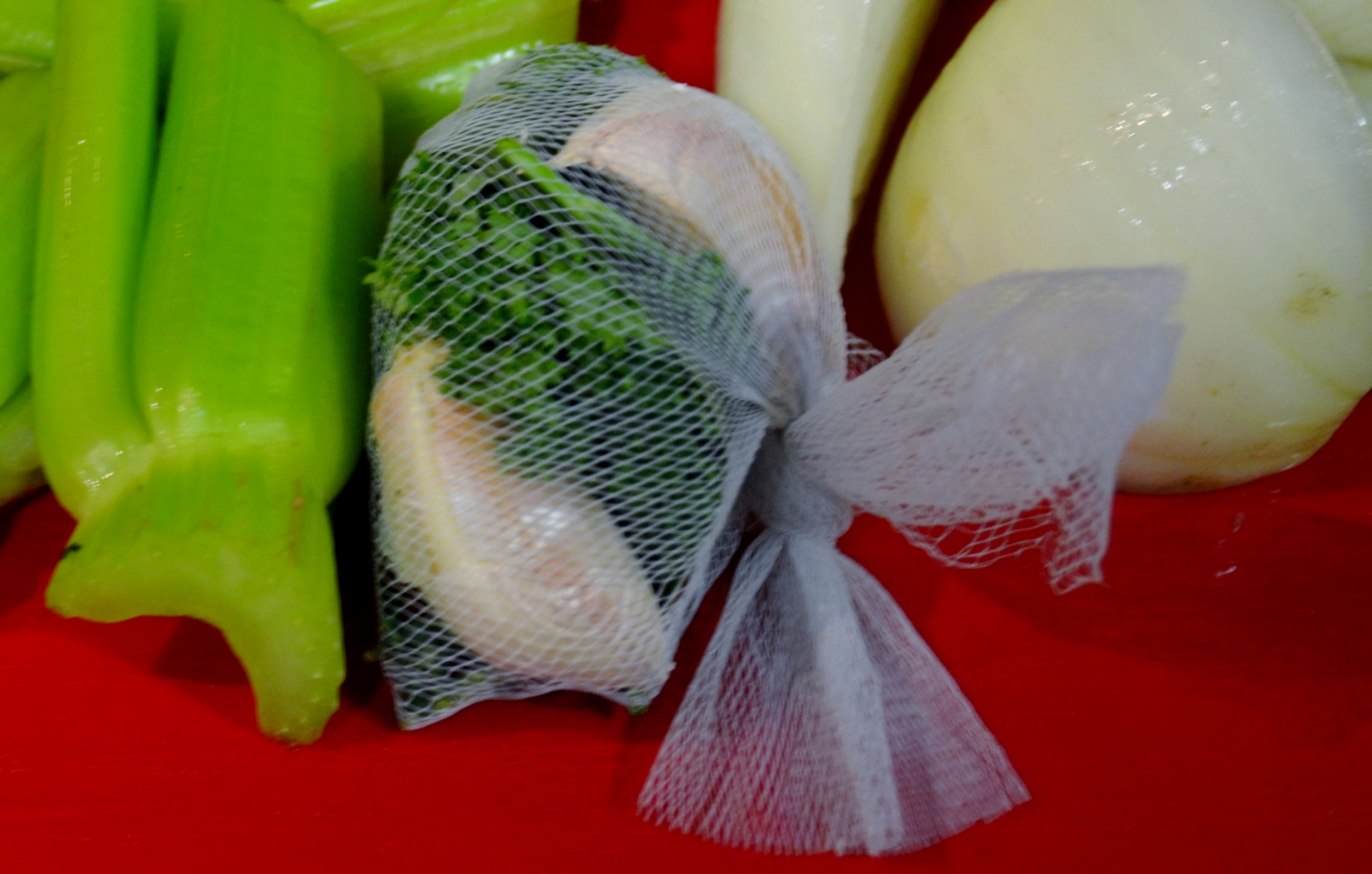 1. Se necesitan una hoja de laurel, 8 ramas pequeñas de perejil, 1 cucharadita de tomillo seco (o 2 ramitas de tomillo fresco), 4 clavos (se pueden omitir) y 3 dientes de ajo, aplastados con el lado del cuchillo y con las pieles. Todo esto se ata en una malla.calpoll6