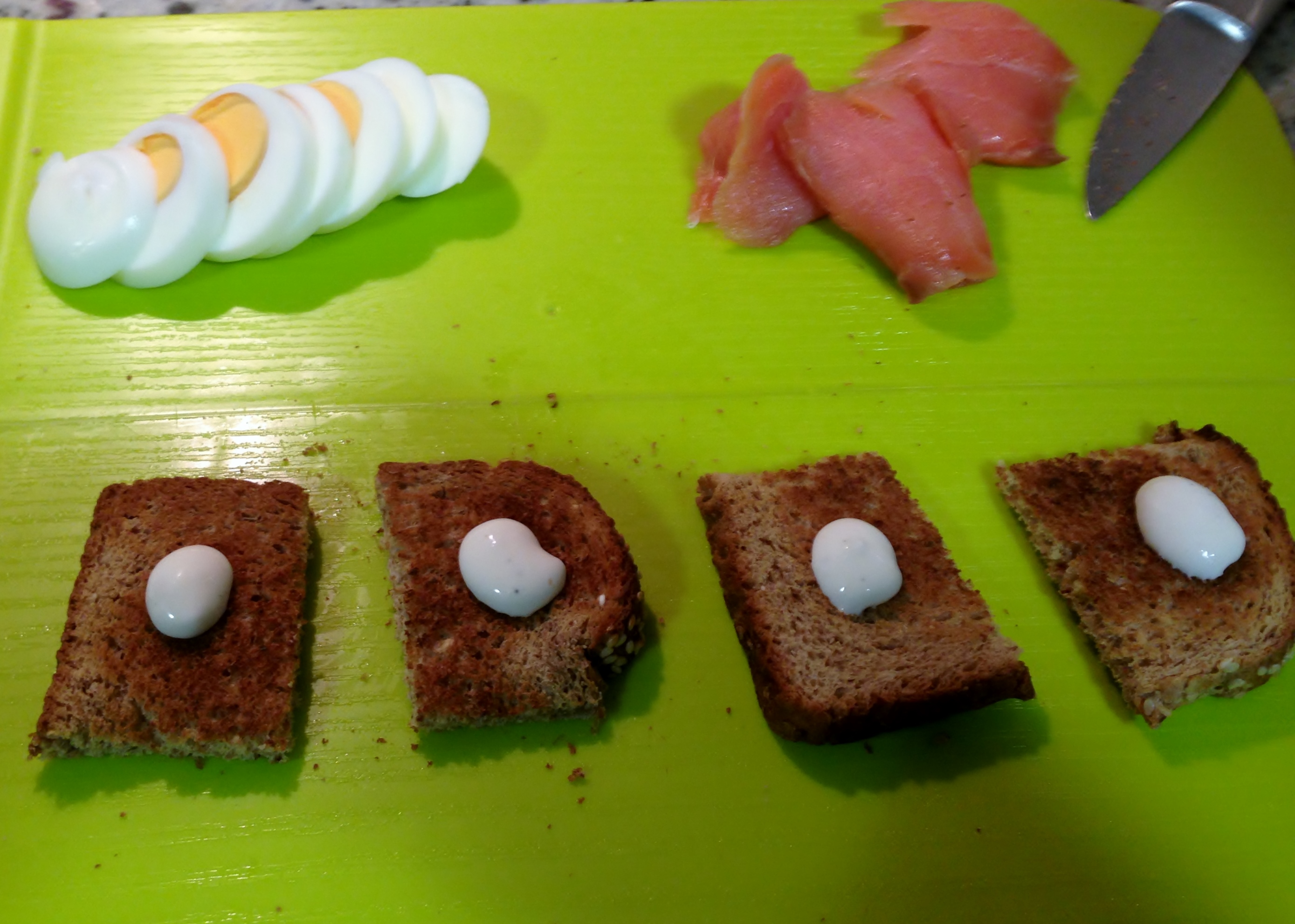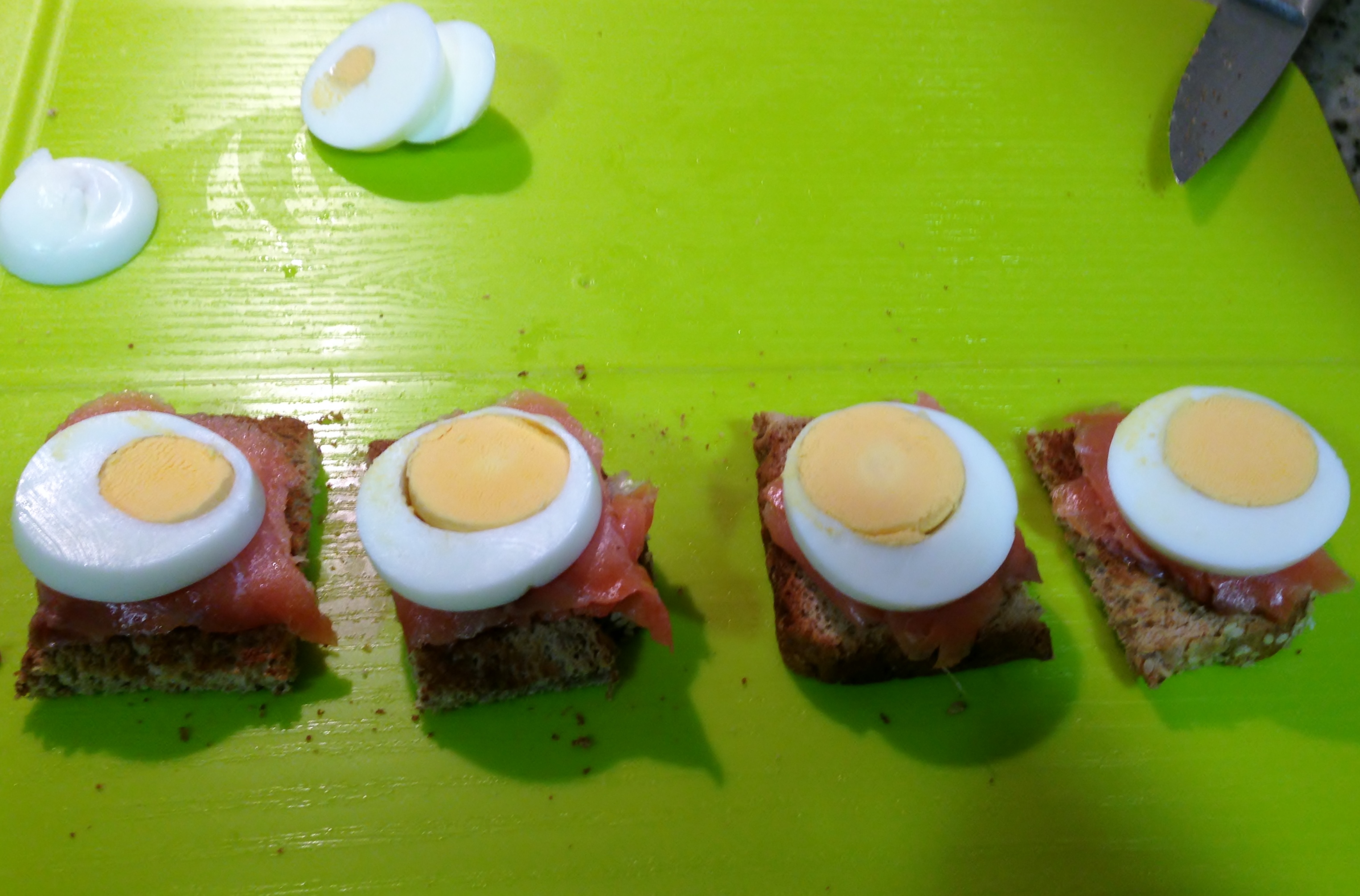 - Cocine el huevo hasta que esté duro (10 minutos en agua hirviendo) y córtelo en tajadas delgadas