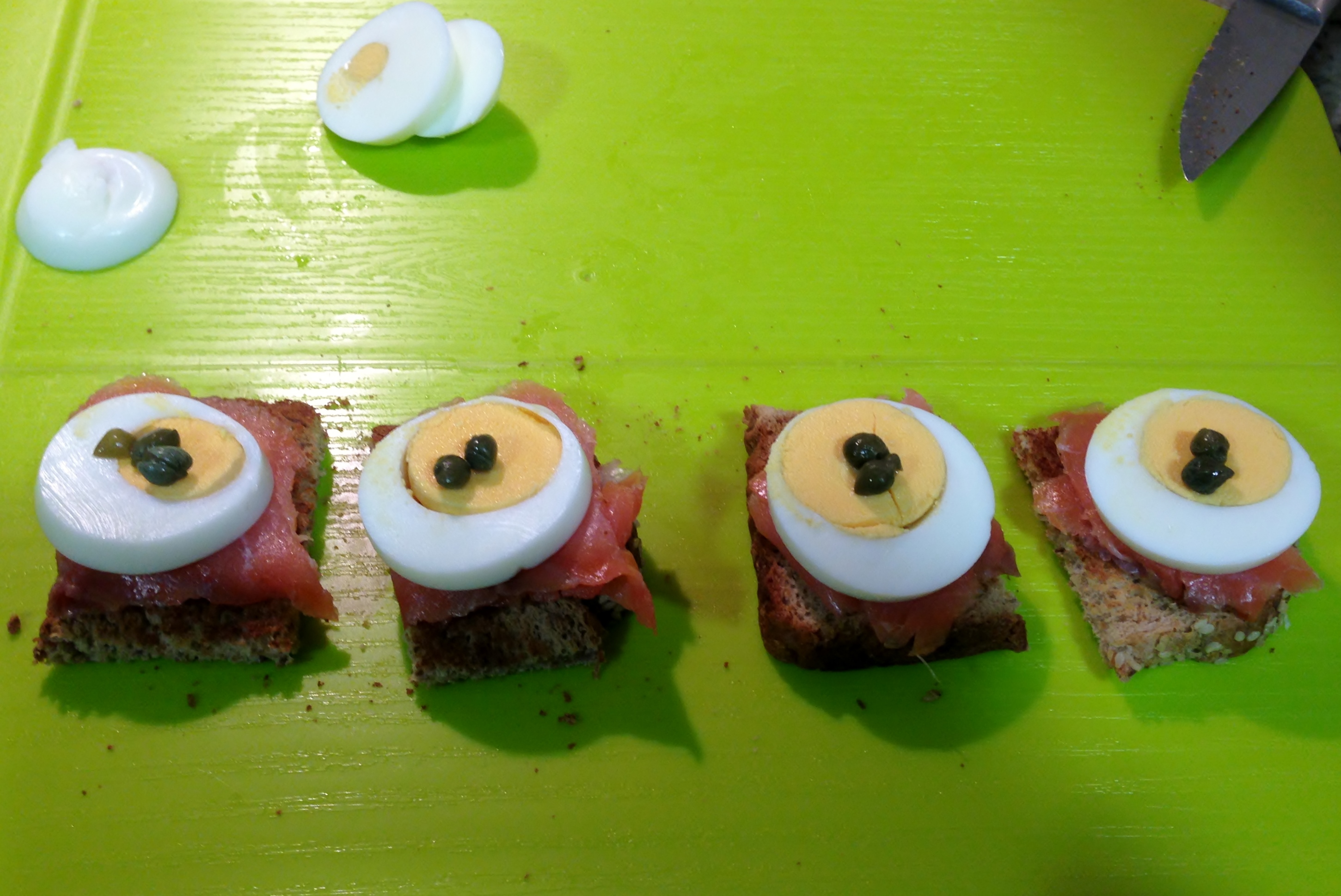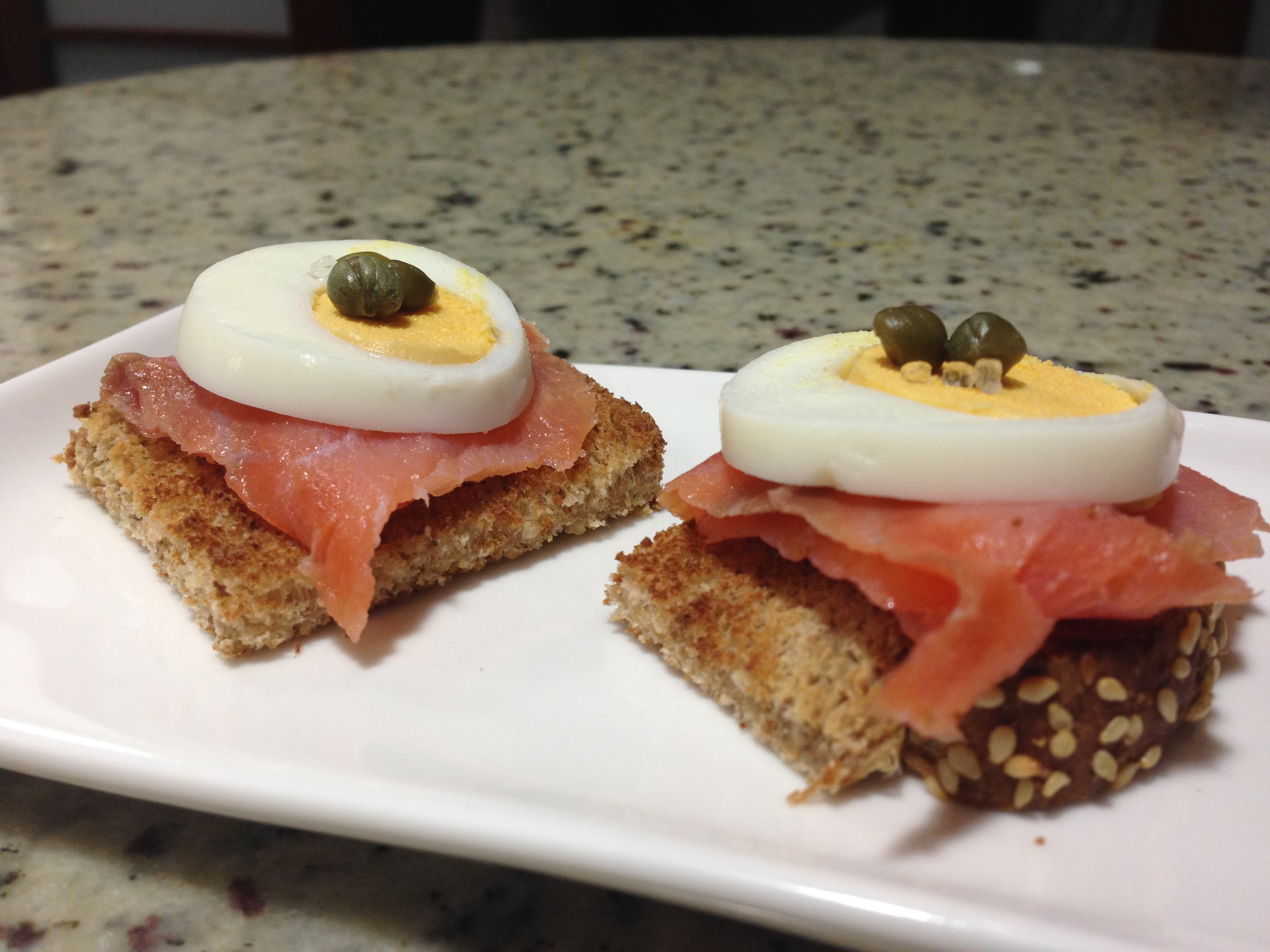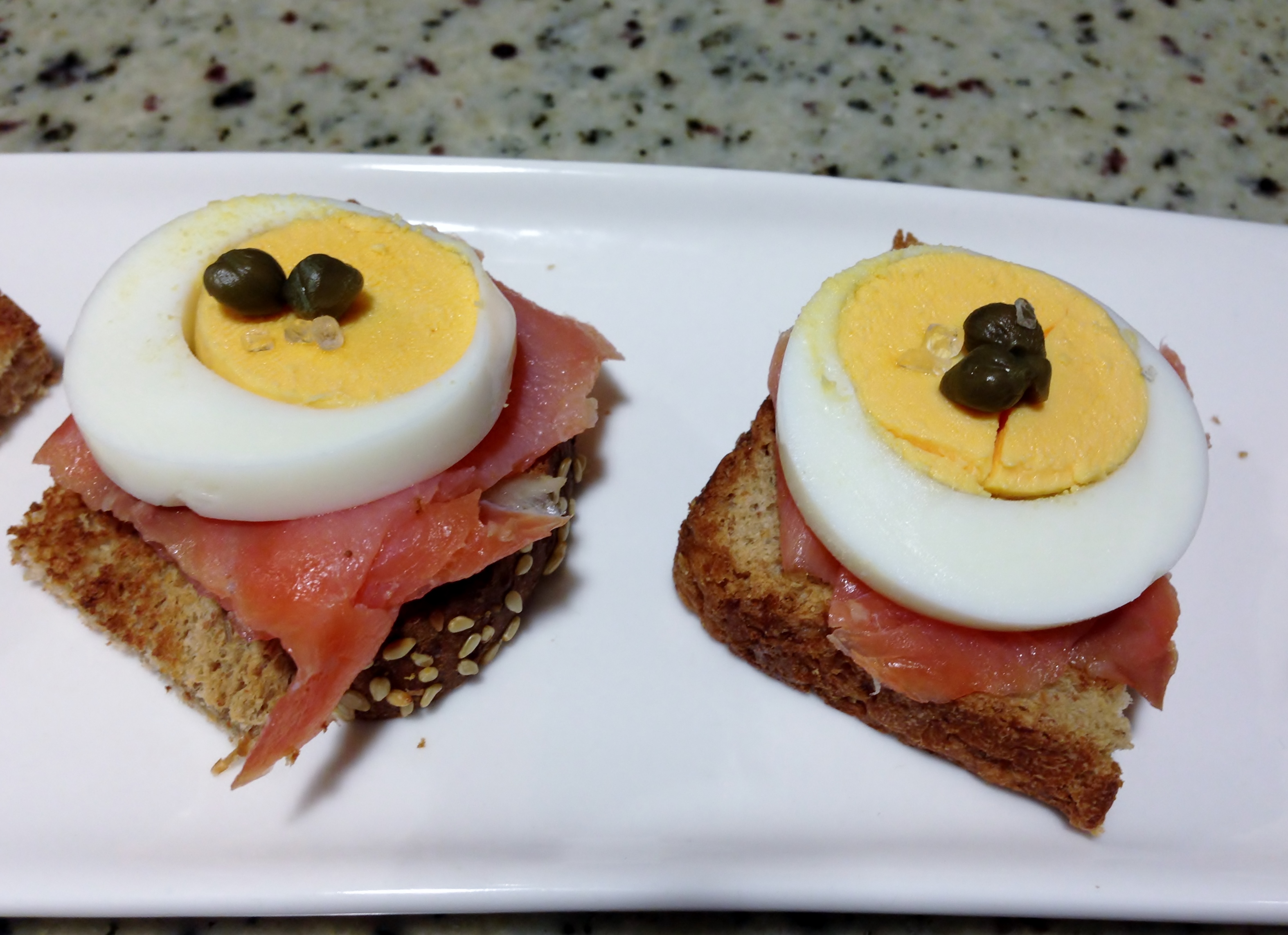 - Arregle 1/4 del salmón encima de la crema de cada pieza de tostada