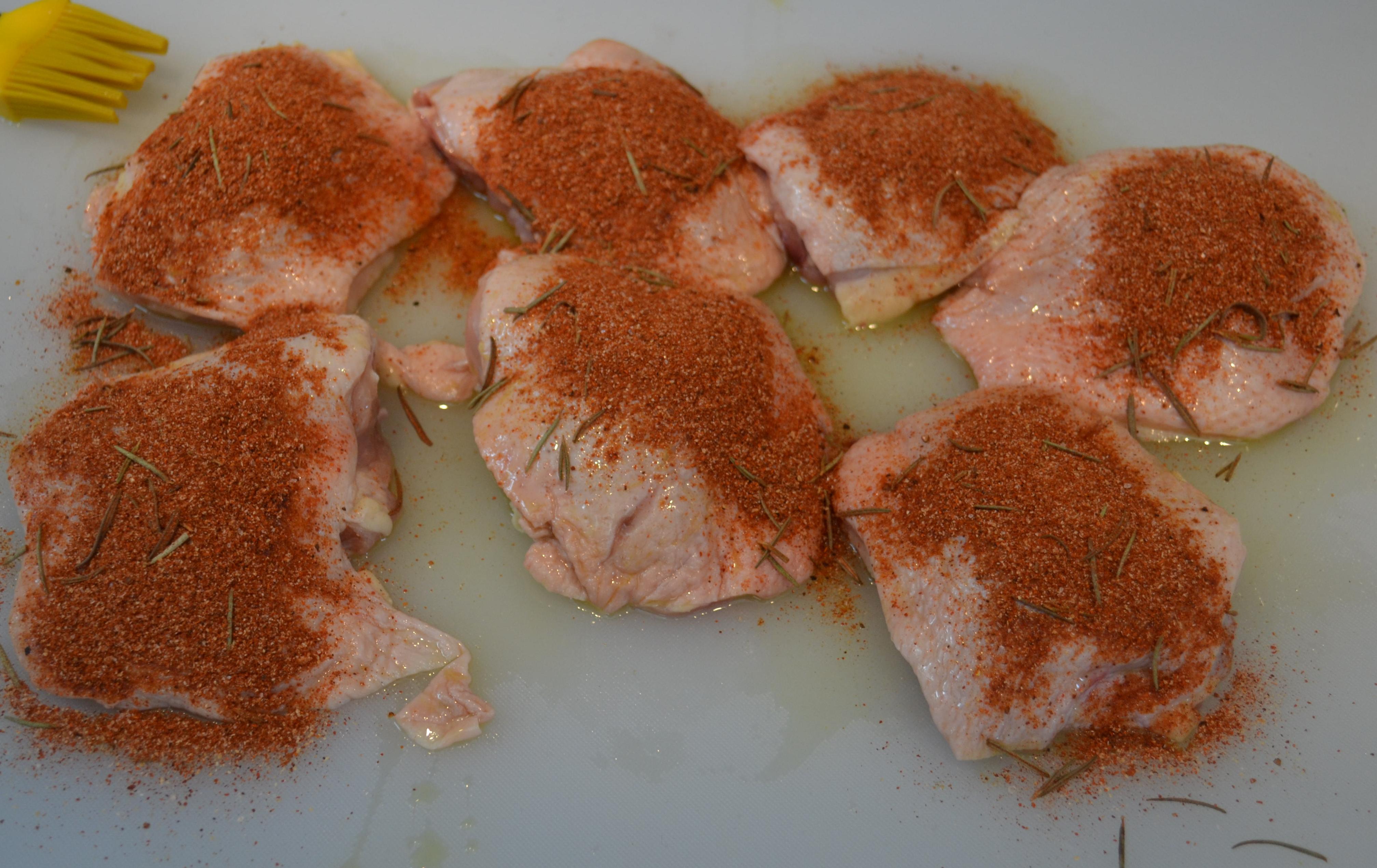 - Unte con generosidad las piezas de pollo con las especies. Use las manos para garantizar que las especies quedan bien impregnadas y reserve por 30 minutos