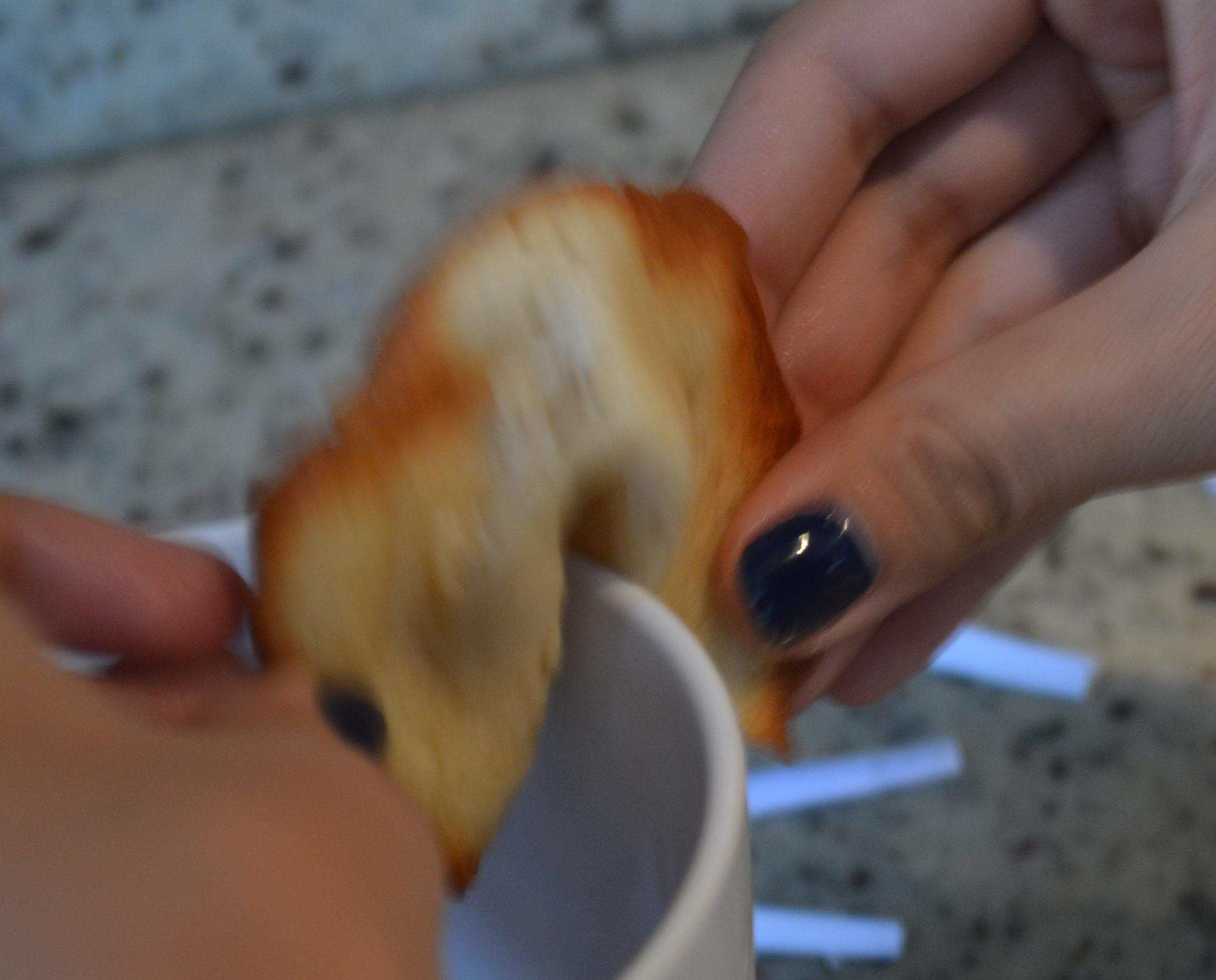 - Con cuidado, tomar la galleta, ubicando el doblez ya hecho en el borde de la taza o mug para formar el quiebre, y halar las puntas hacia abajo, una dentro y una fuera de la taza.