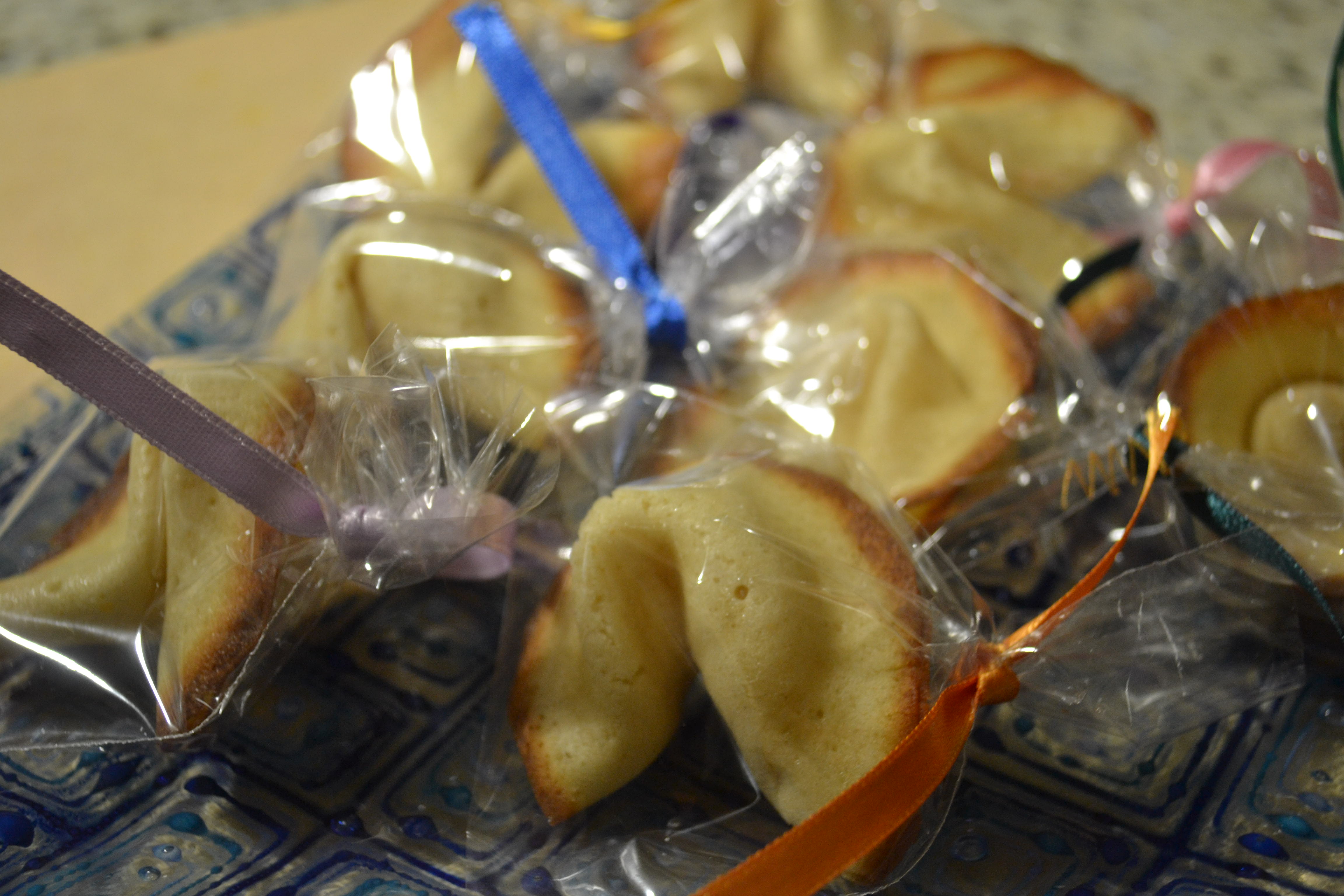 - Precalentar el horno a 400F. Engrasar una lata para el horno. Escribir las fortunas en papelitos de 8-10 cm de largo por 1 cm de ancho.