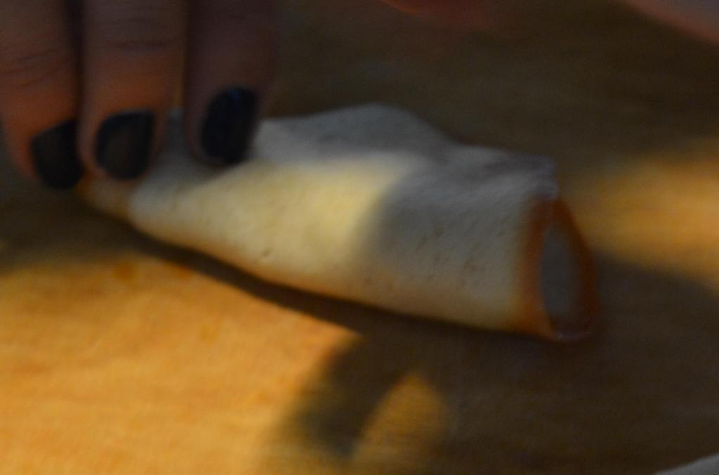 - Cuando esté lista la galleta, sacarla del horno y rápidamente voltearla en la superficie de madera. Ubicar la fortuna hacia el centro de la galleta, y doblar en la mitad.
