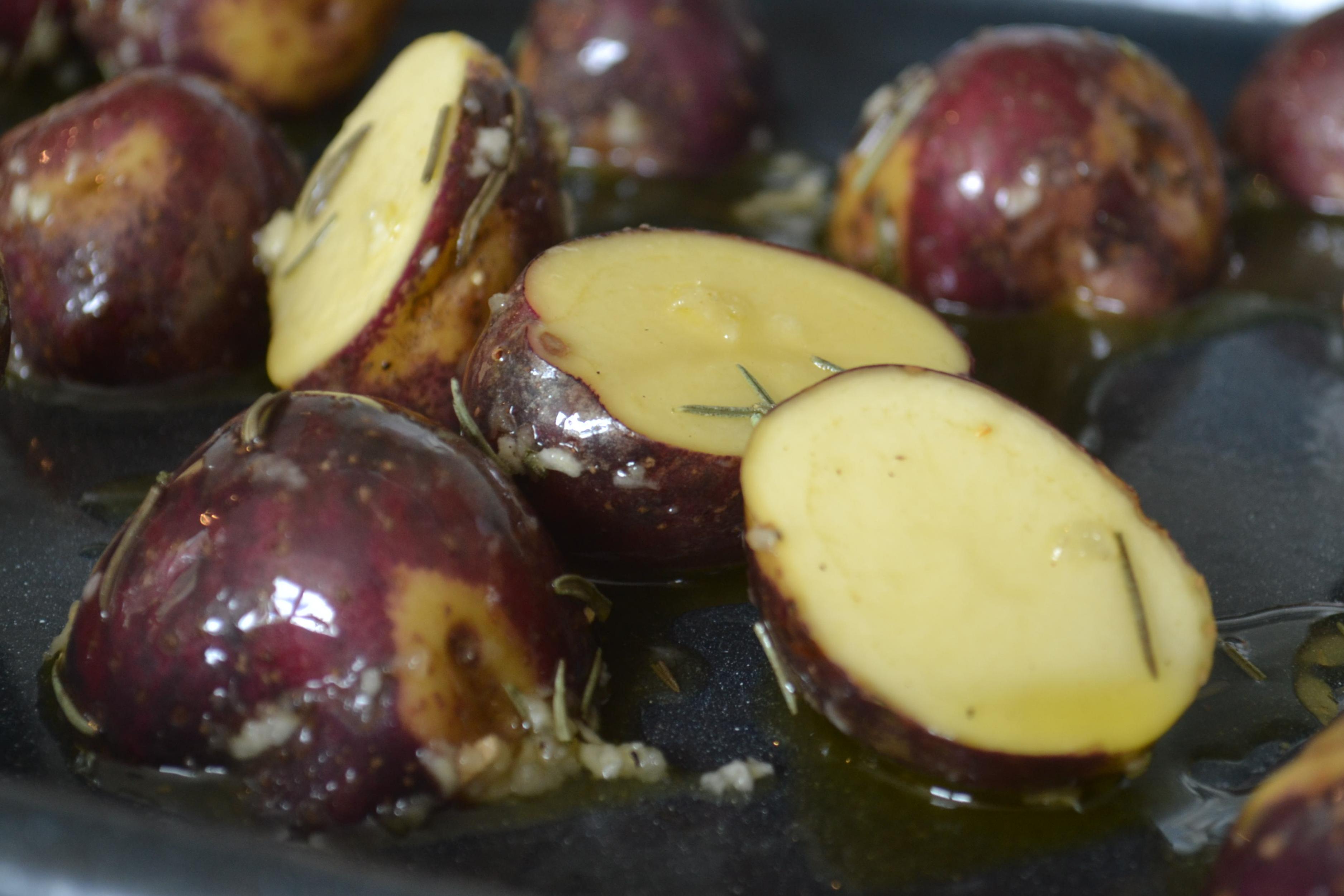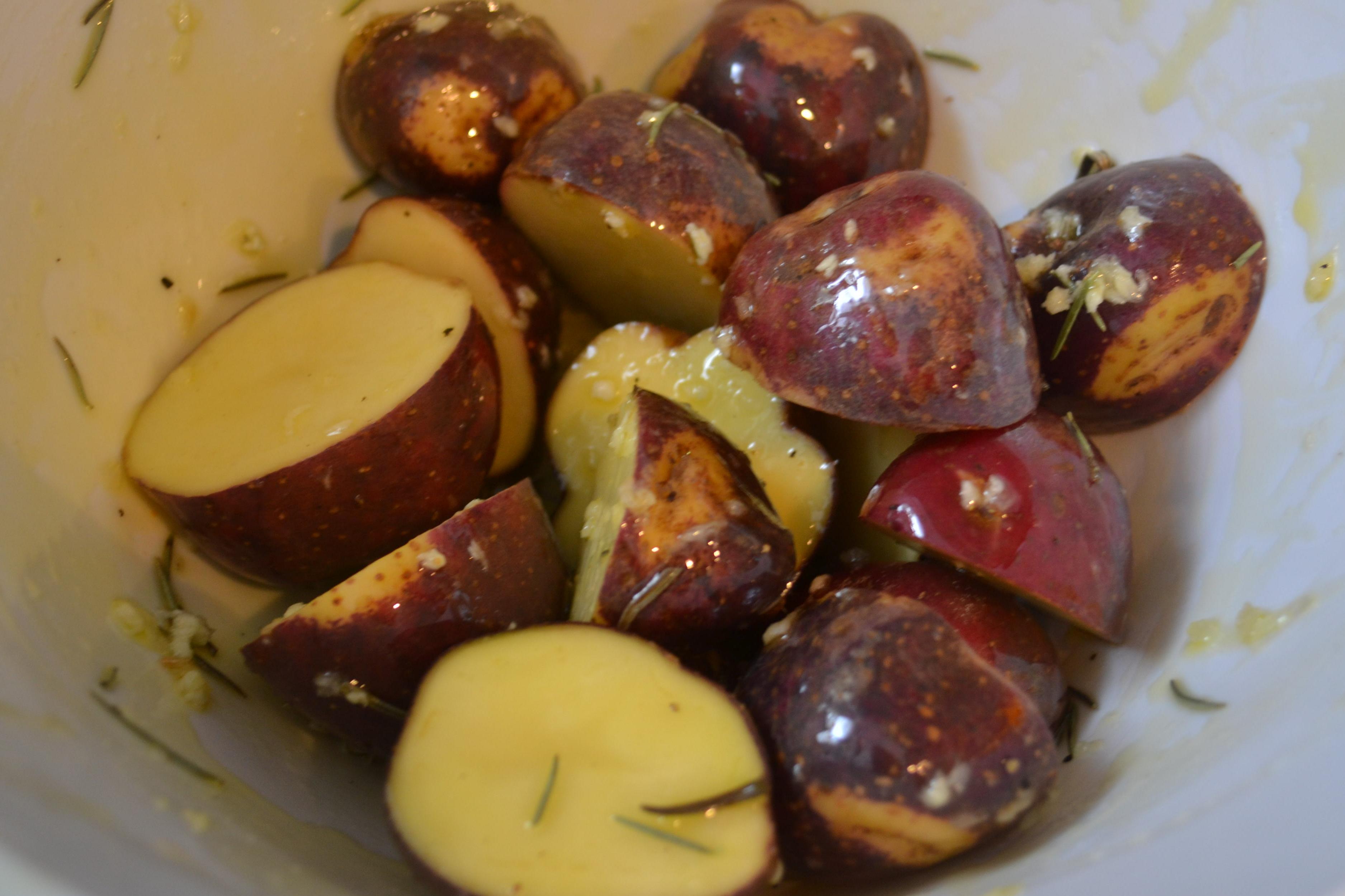 - En un recipiente, mezclar las papas con el aceite, romero, ajo, y sal y pimienta al gusto.