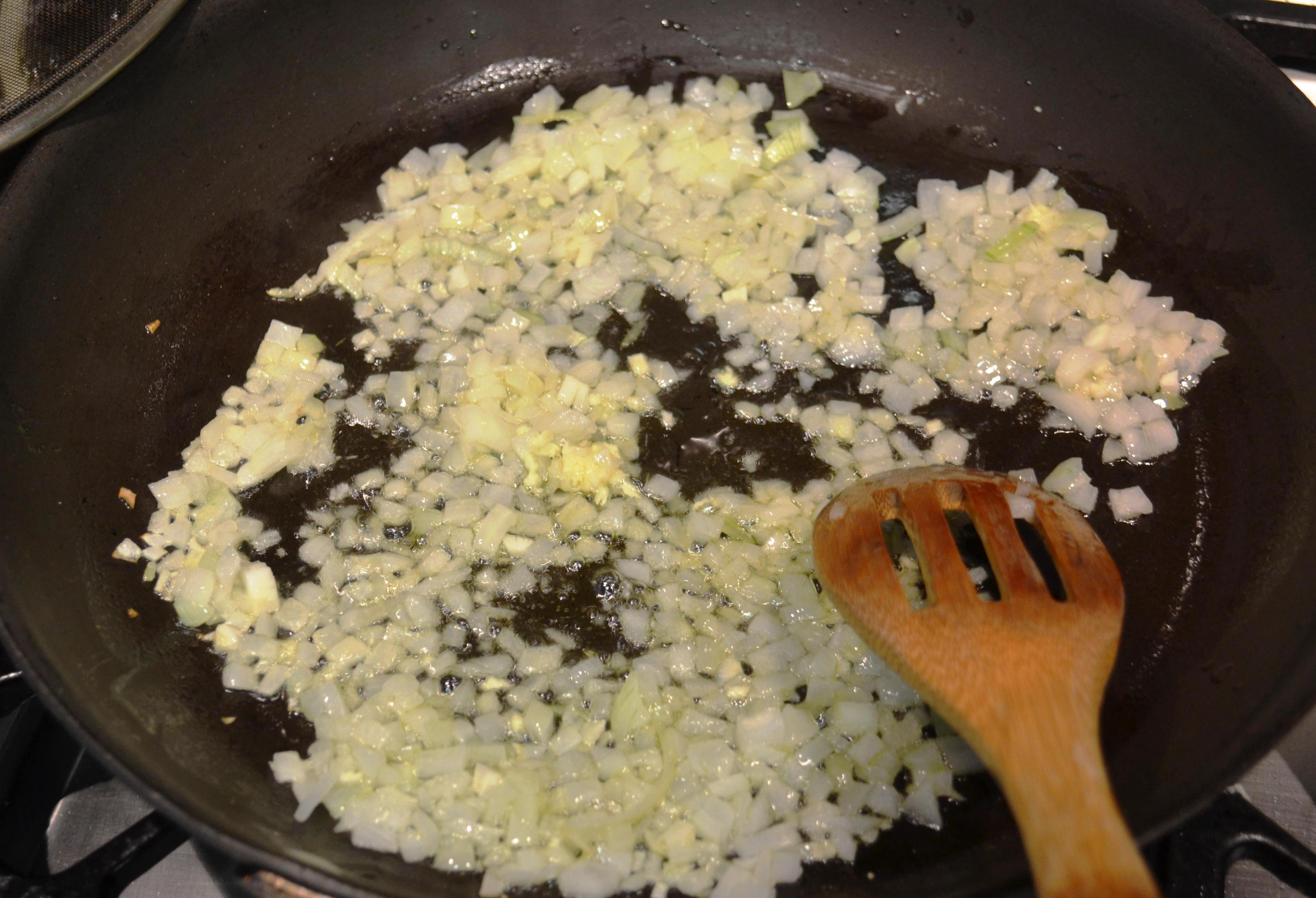 - En un sartén grande caliente 1 cucharada de aceite de oliva y 1 cucharada de mantequilla, agregue la cebolla y el ajo y cocine revolviendo permanentemente hasta que la cebolla esté transparente.