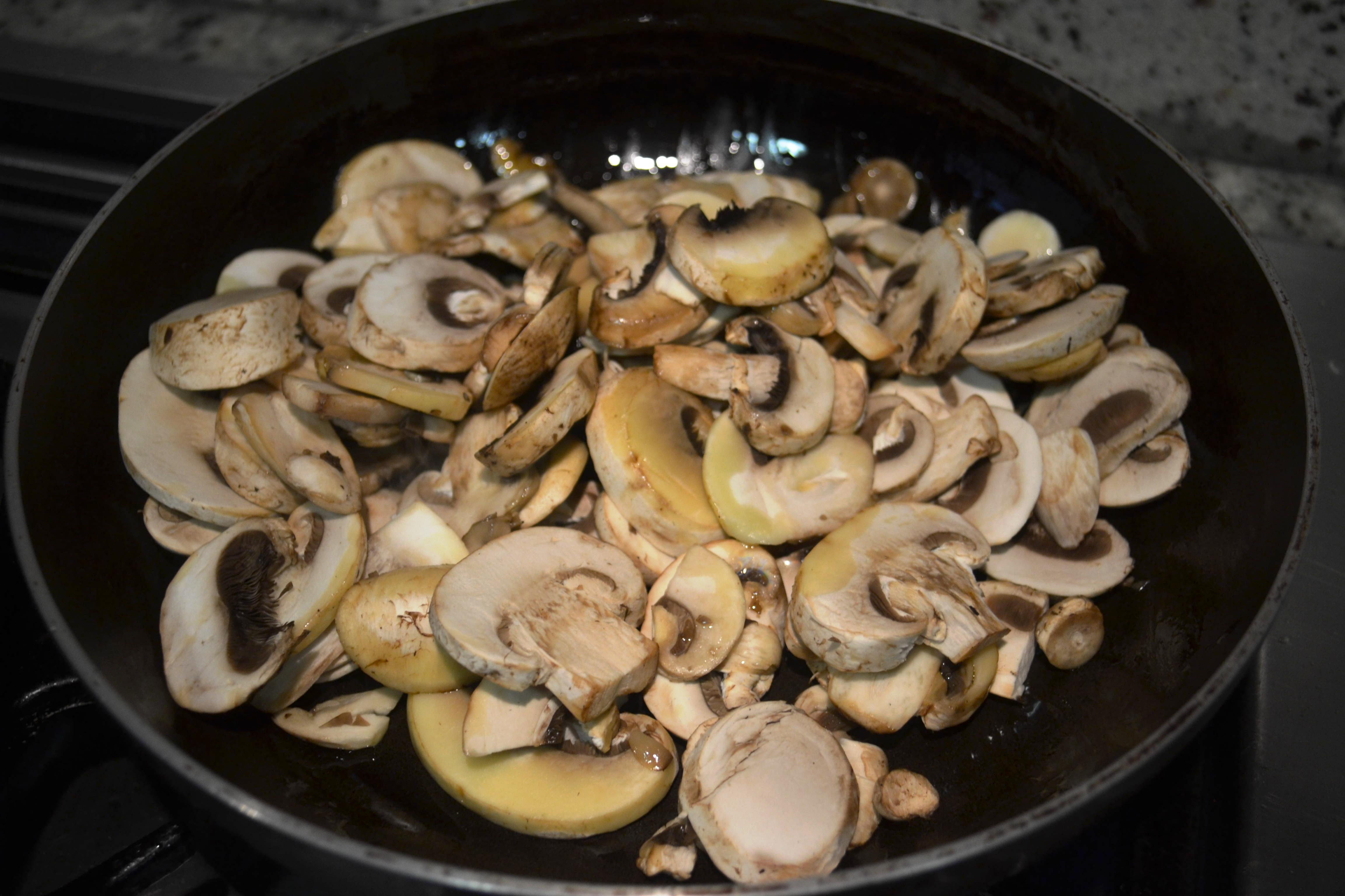 - En un sartén diferente caliente el aceite y la mantequilla restantes, agregue los champiñones y cocinelos levemente hasta que queden suaves.