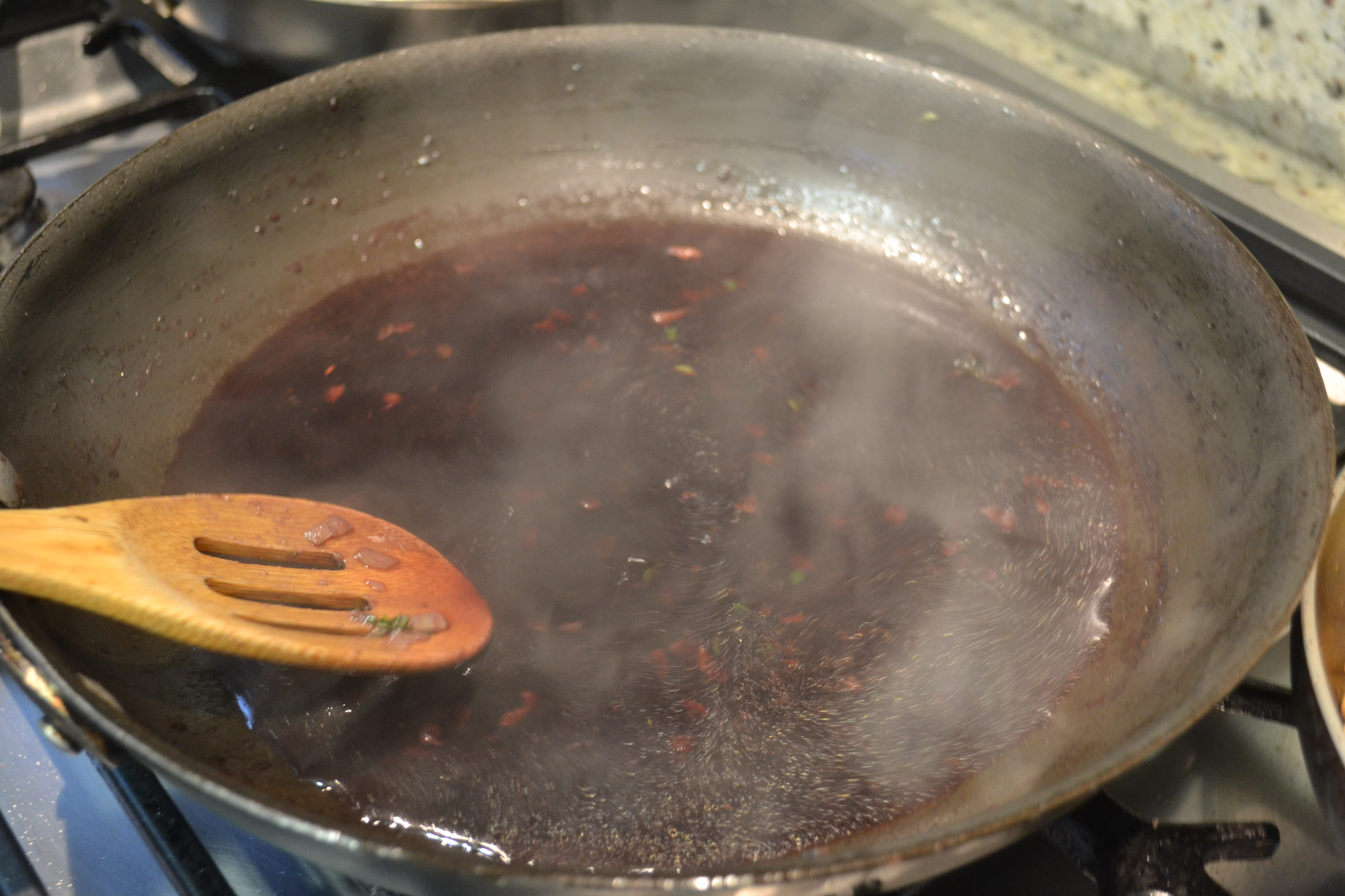 - En el sartén que cocinó la carne, agregue el vino tinto y a fuego lento cocine y revuelva con una cuchara de madera hasta que quede una salsa con los residuos de cocinar la carne (deglaseado).