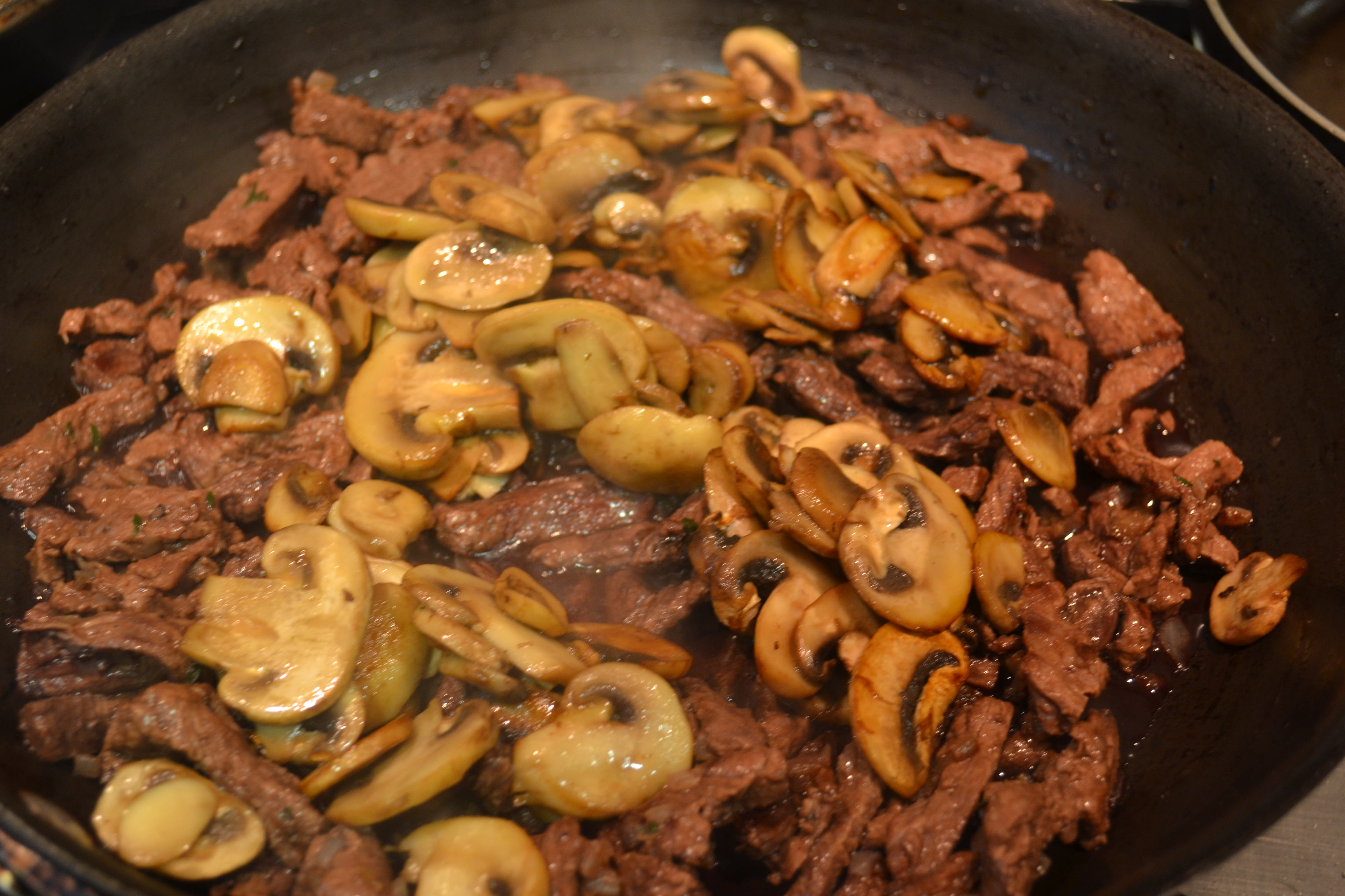 - Agregue la carne y los champiñones (con todos sus jugos) y el tomillo (las hojas sin el tallo).