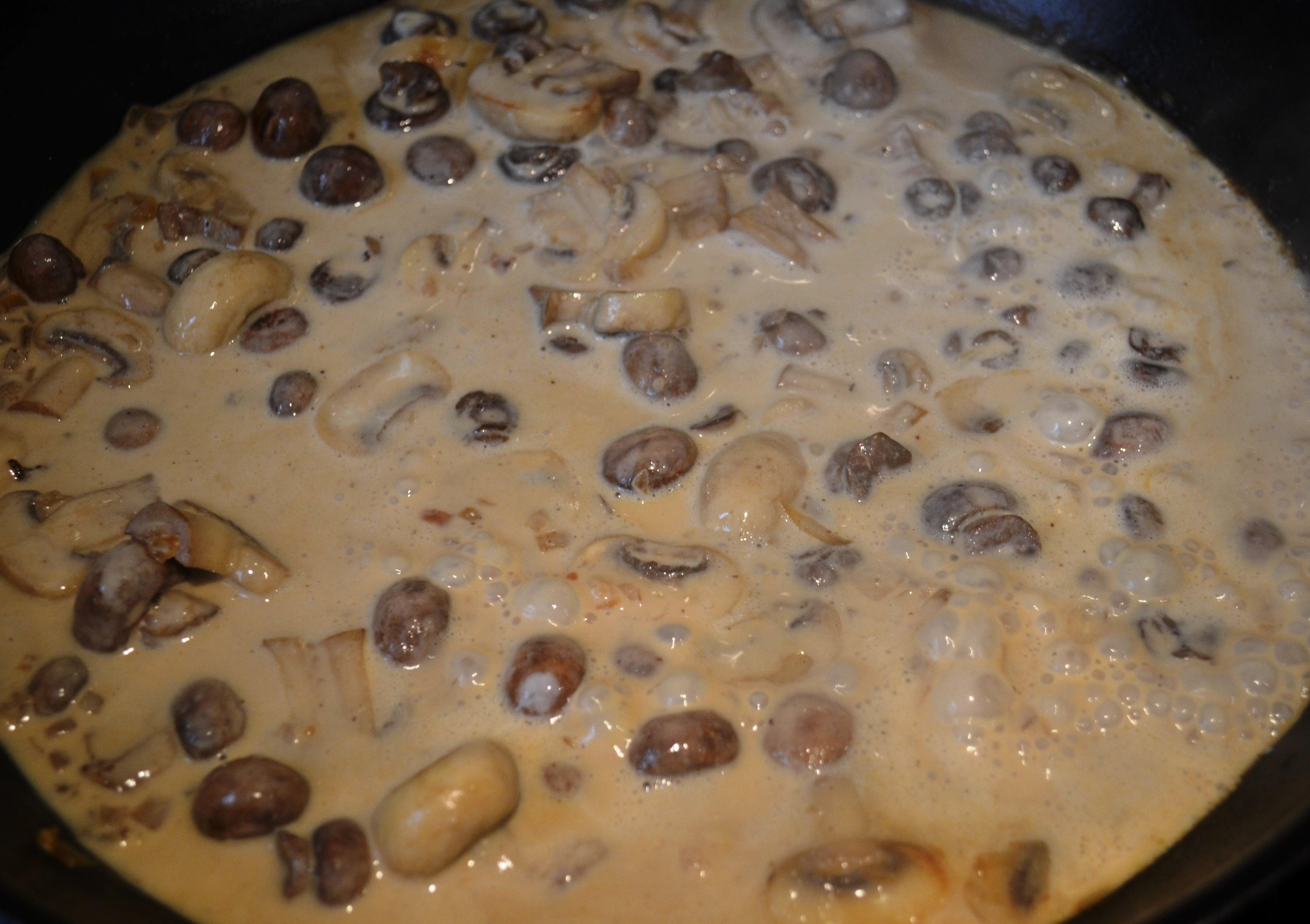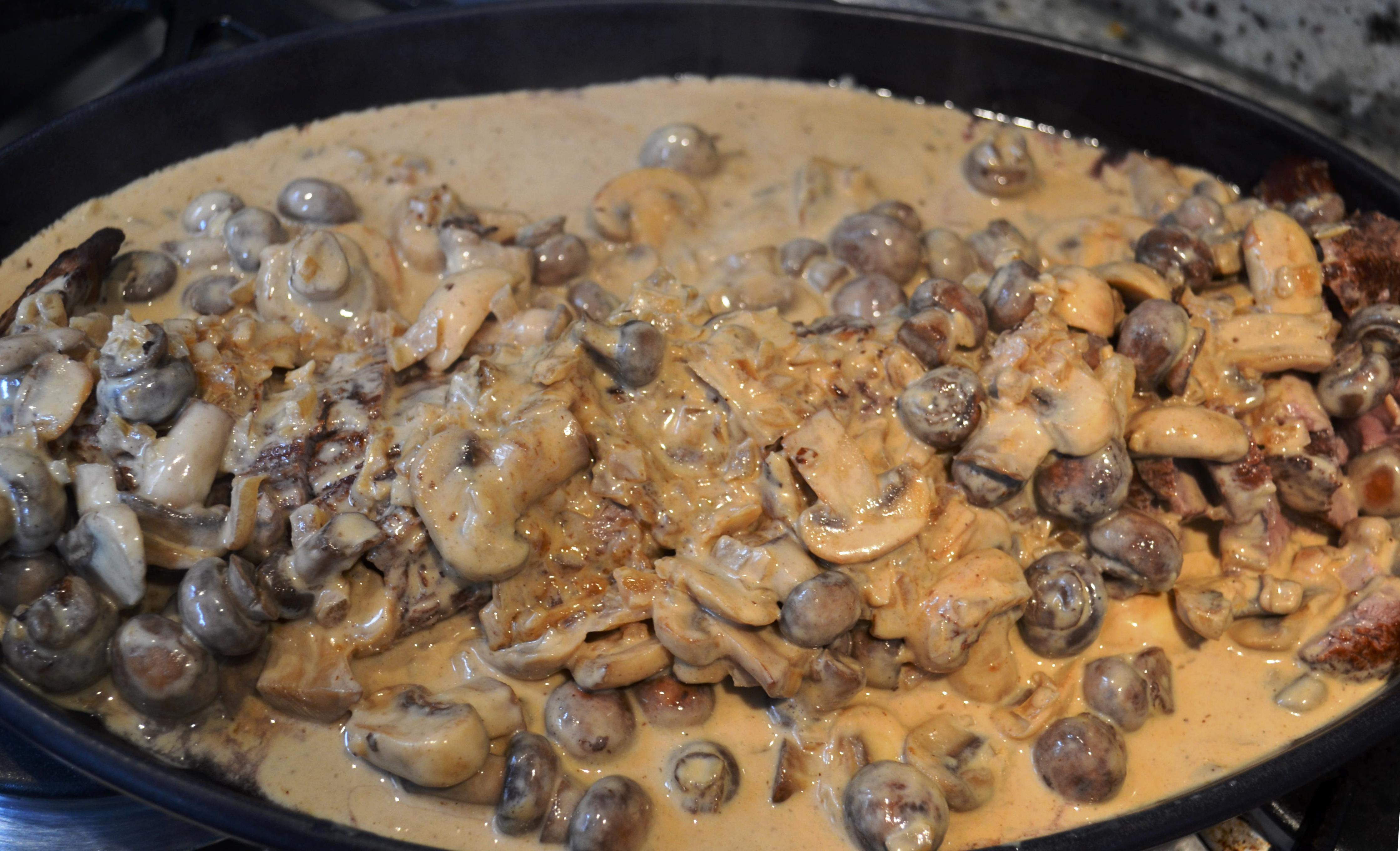 - Agregue el brandy y flambee, luego agregue el vino, la mostaza y la crema de leche. Revuelva y reduzca hasta que consiga una salsa espesa.
