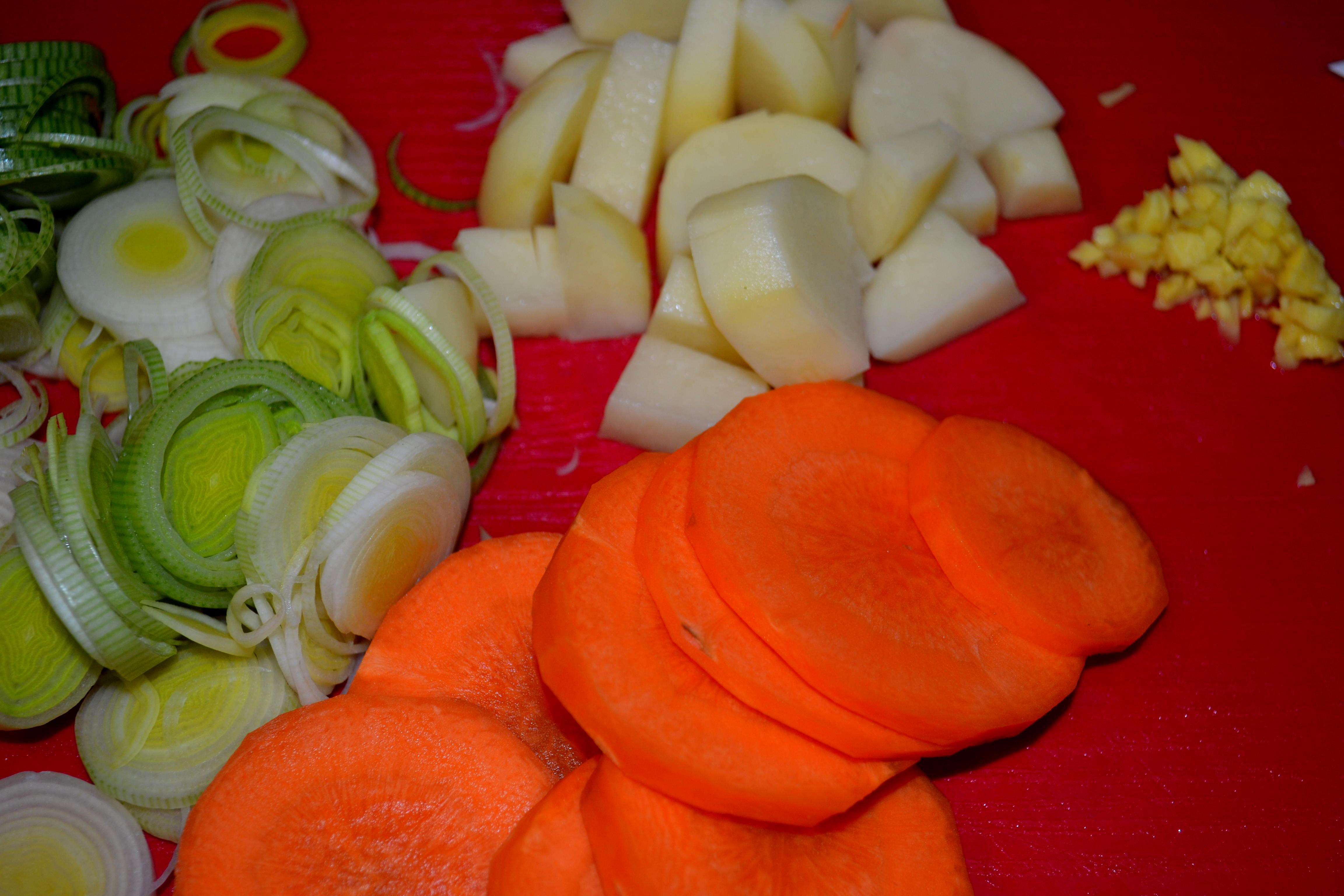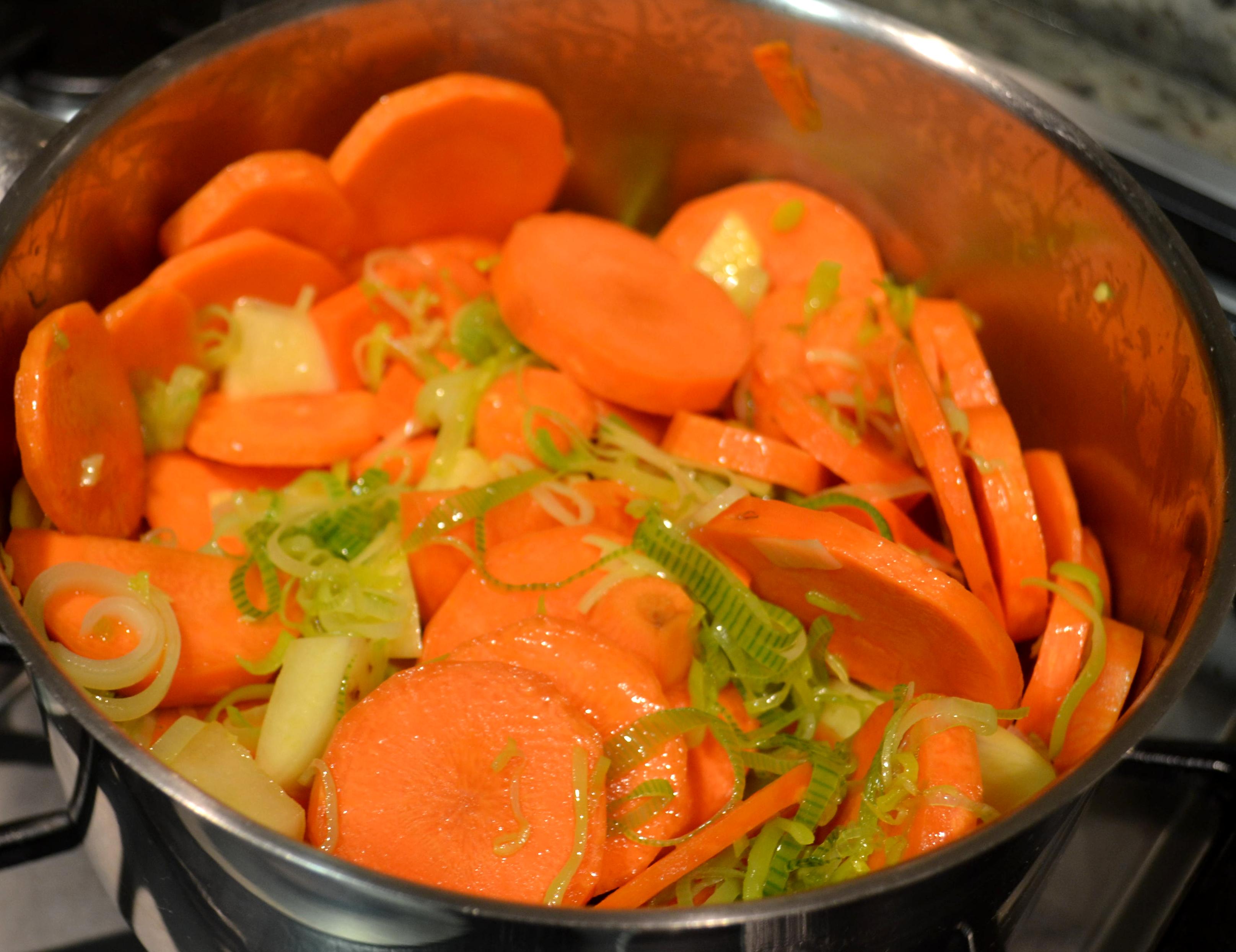 - Adicione las zanahorias, las papas y el jengibre y sofría hasta que los vegetables ablanden, unos 5 minutos adicionales.