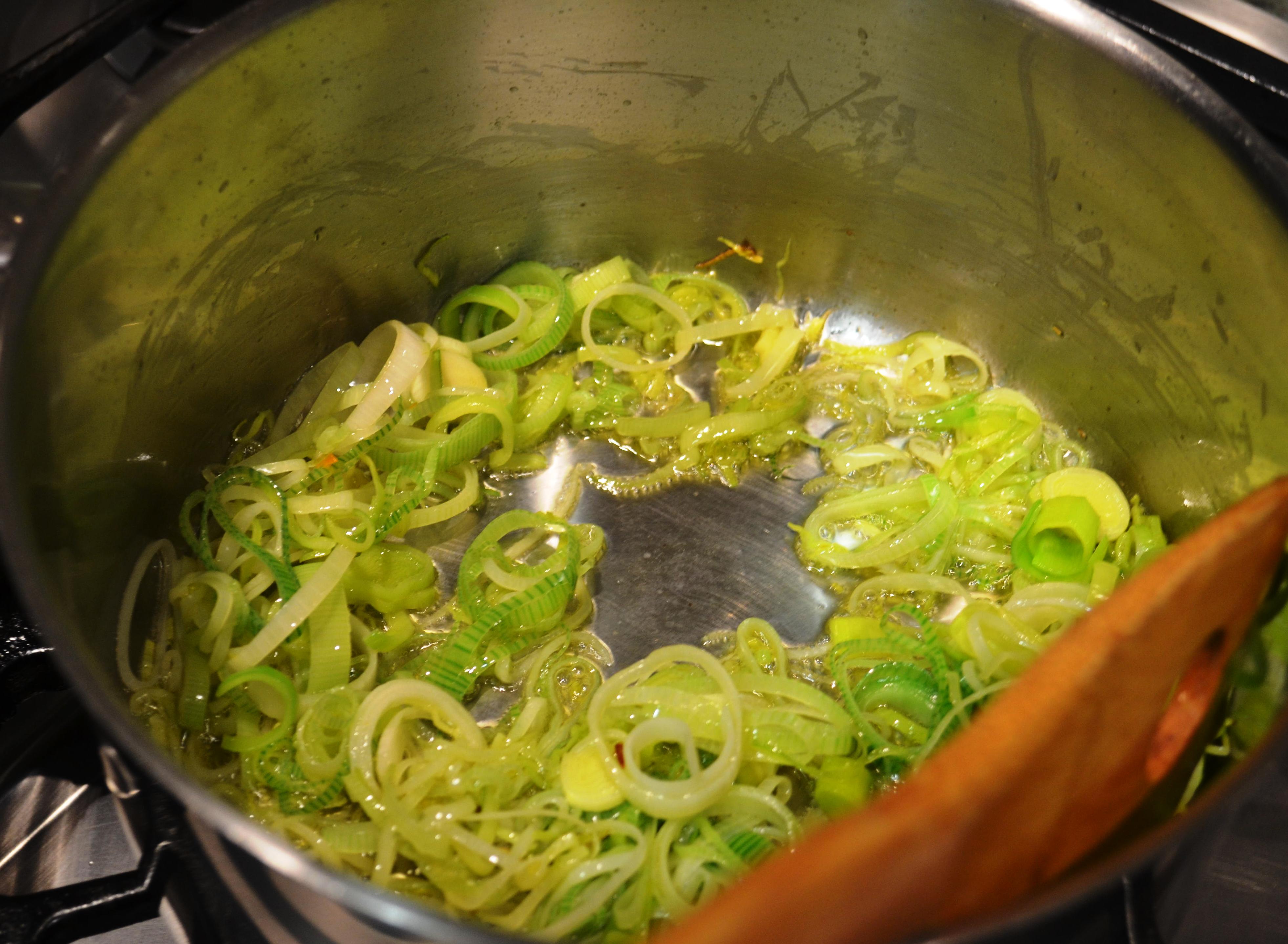 - En un sartén, caliente el aceite y adicione los puerros. Sofría por unos 3 minutos, hasta que se suavicen.