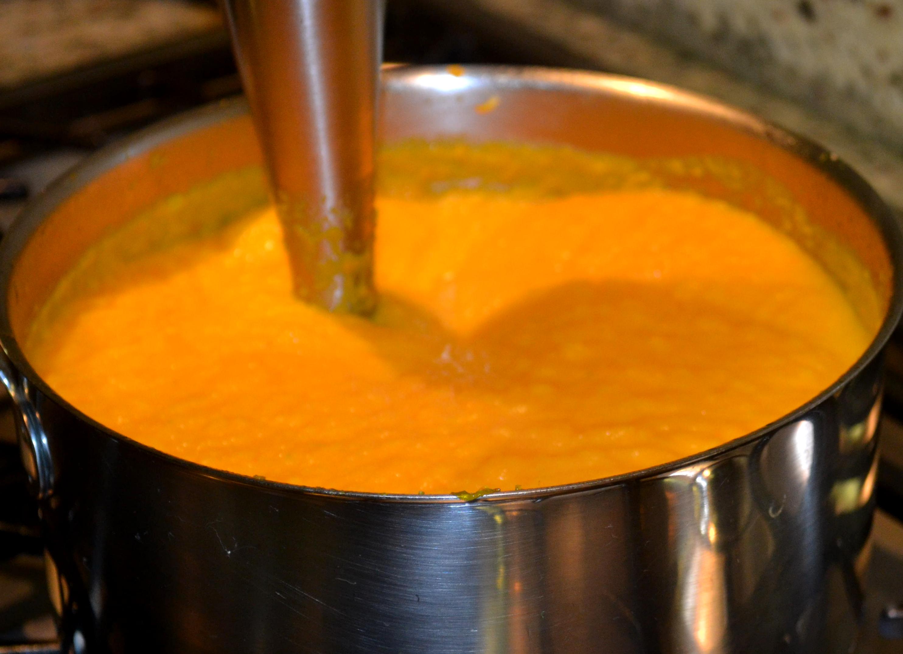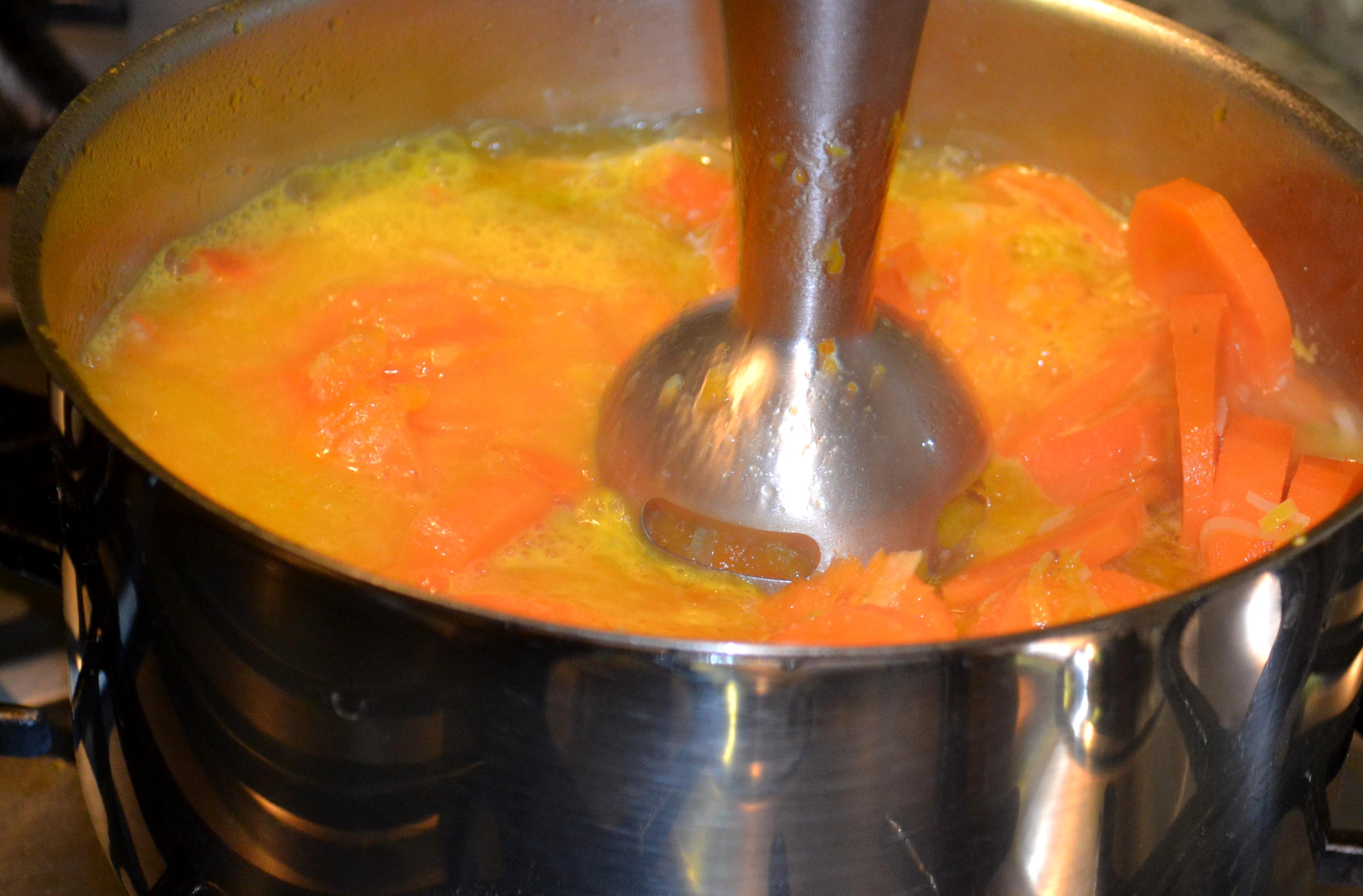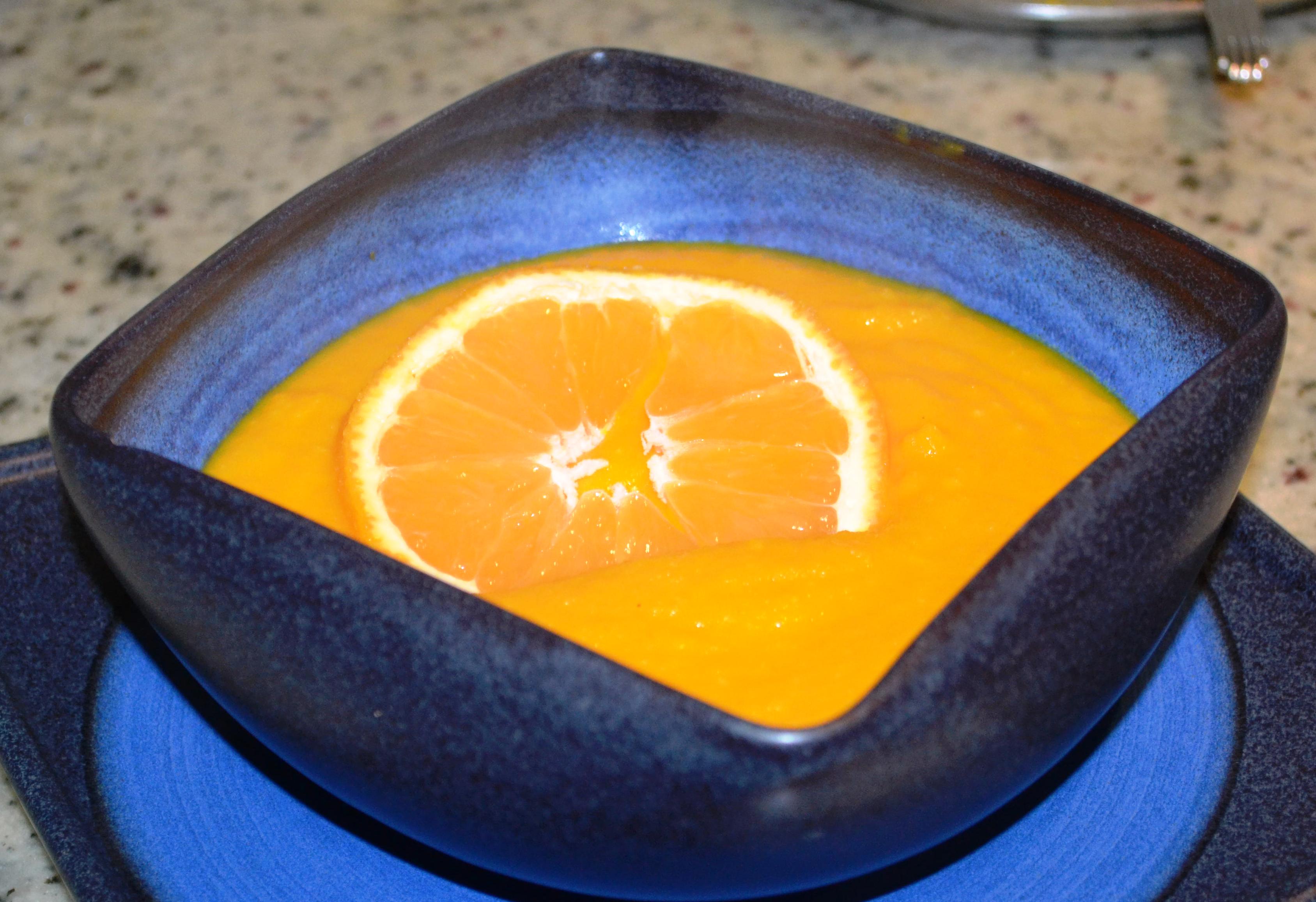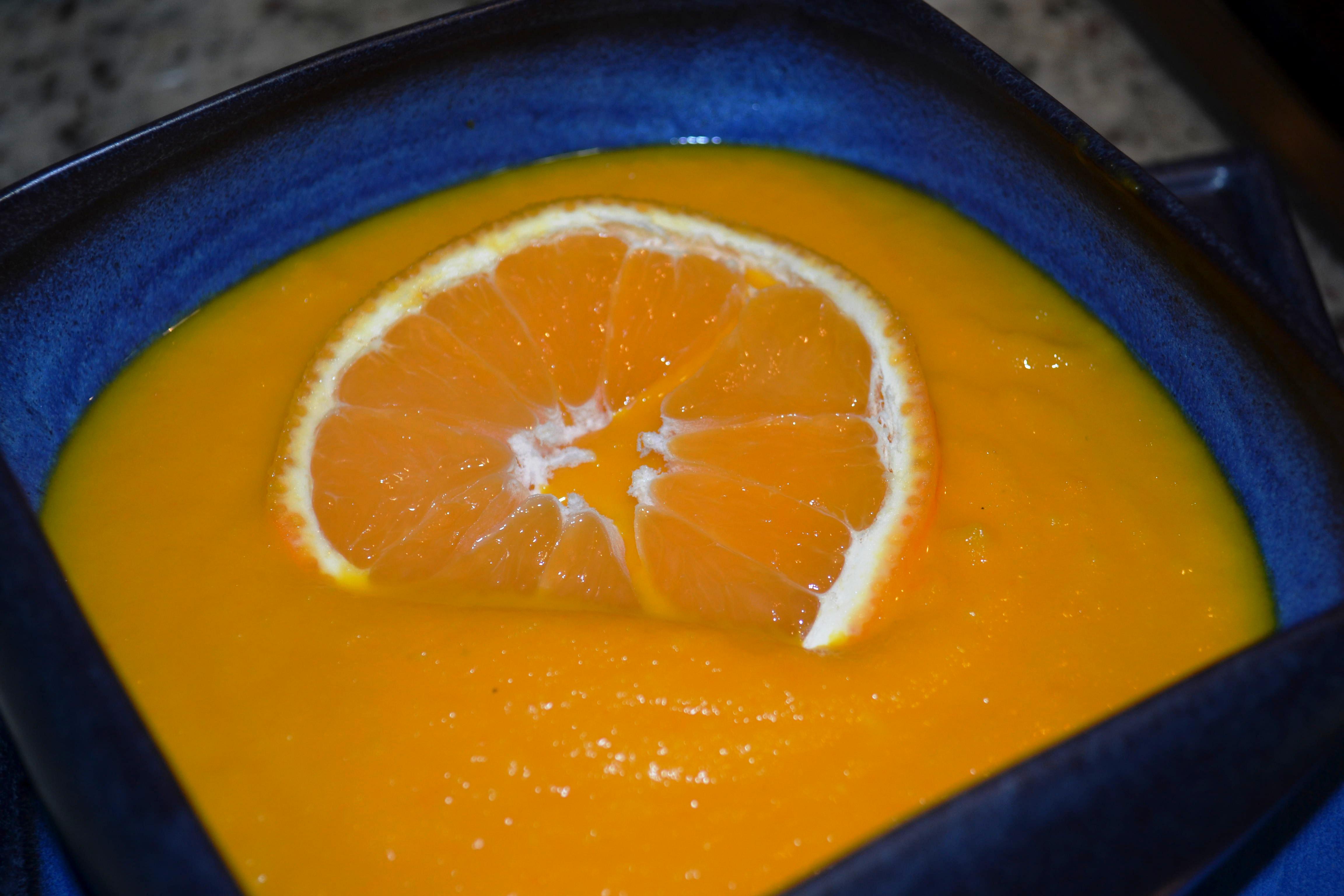 - Vuelva a poner la sopa al fuego y añada el jugo y la ralladura de naranja.
