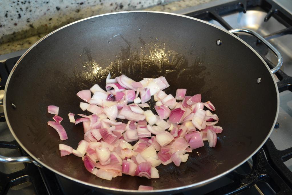 - En un sarten grande o en un wok, caliente el aceite a fuego medio y dore la cebolla hasta que esté traslúcida (3 minutos aproximadamente).