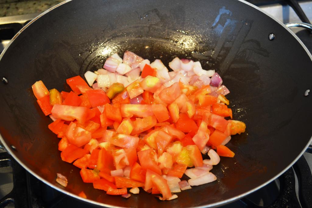 - Agregue el tomate, el pimenton, la paprika, el oregano, las hojas de laurel y el achiote. Cocine por 5 minutos adicionales