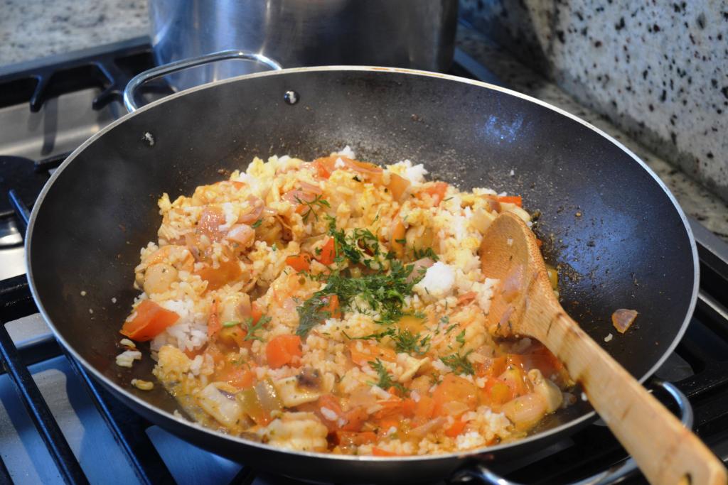 - Agregue el arroz y el cilantro, sal y pimienta. Mezcle todos los ingredientes y sirva inmediatamente