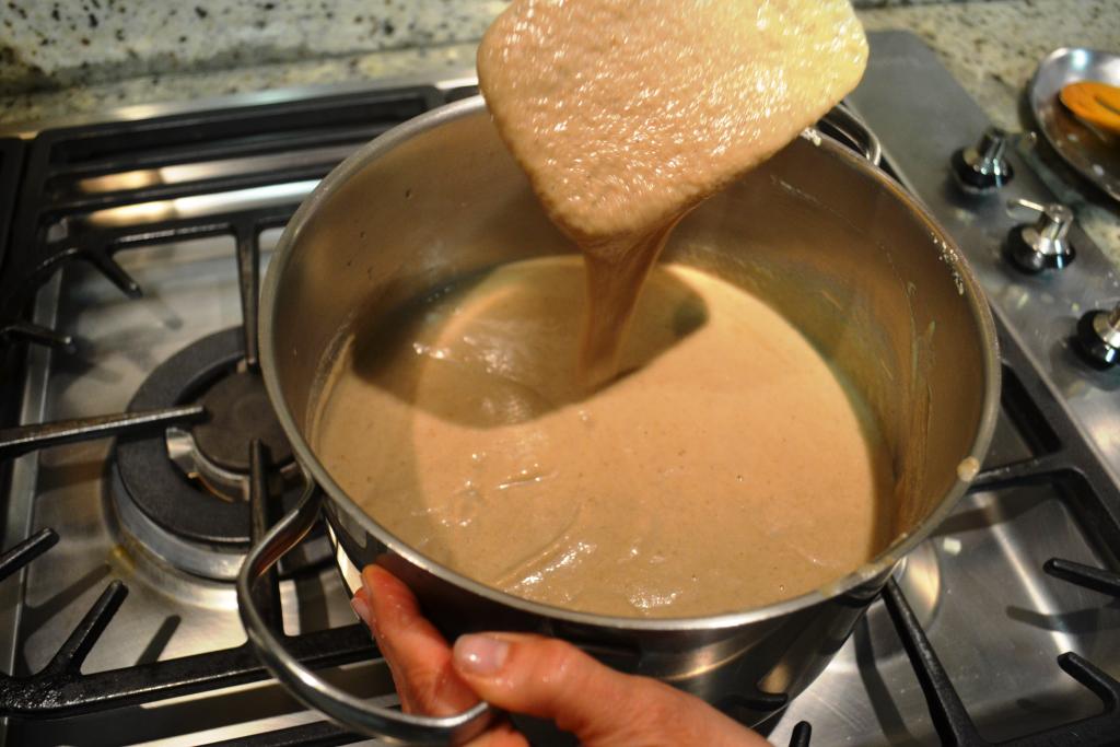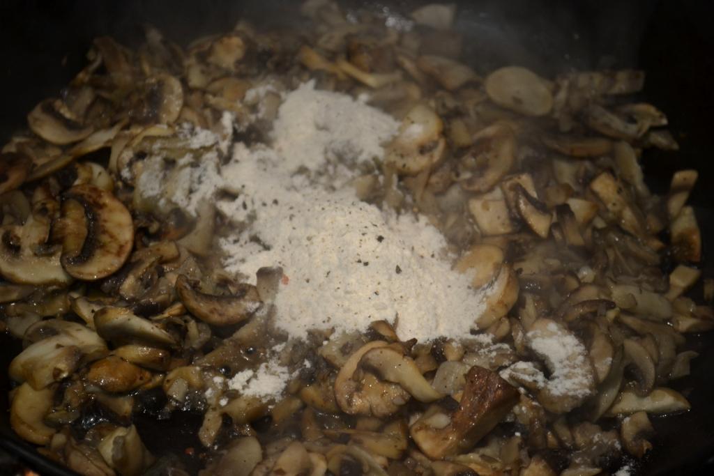 - Revuelva para que los champiñones queden cubiertos y se cocine la harina durante un minuto.
