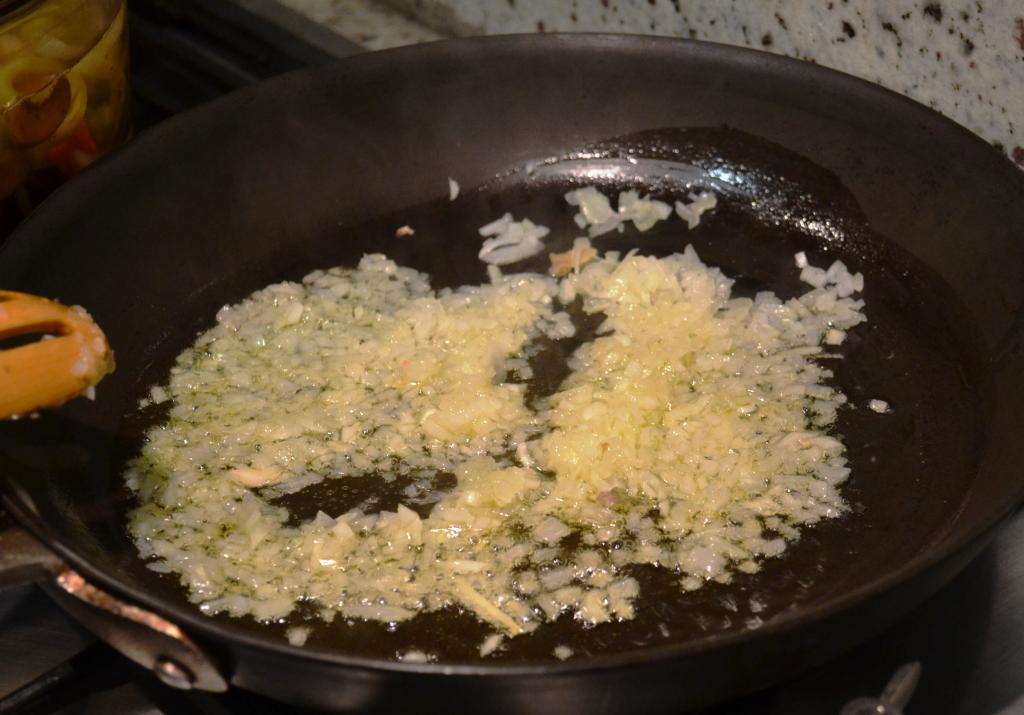 - En un sarten grande caliente el aceite de oliva y adicione la cebolla y saltee hasta que este suave (5-7 minutos)