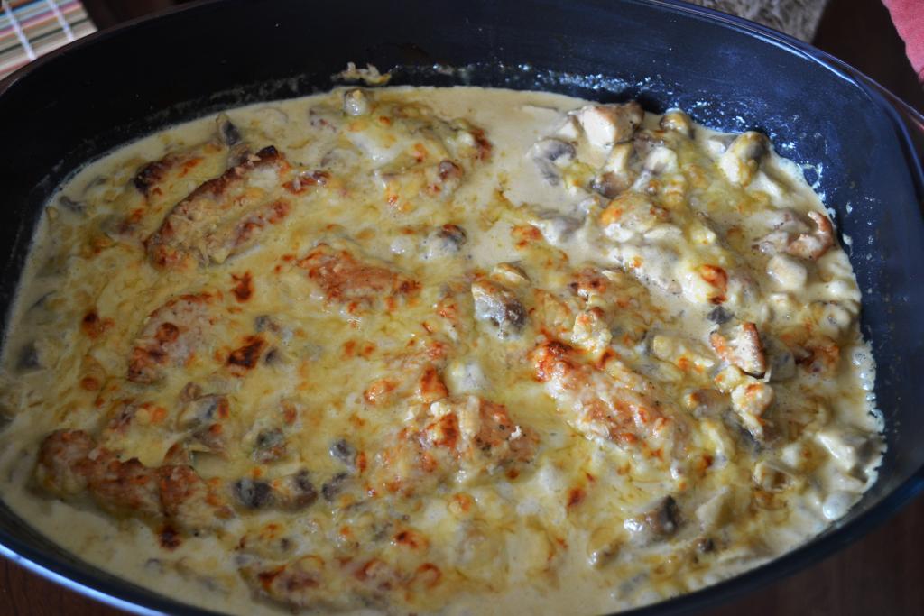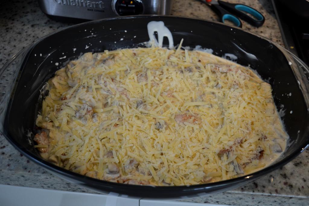 - Agregue a la refractaria la salsa de champiñones y rocie encima la crema de leche restante y el queso parmesano.