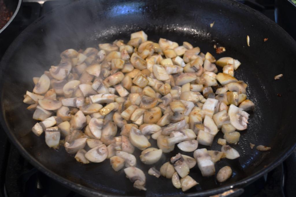 - Corte los champiñones en cuadros y salteelos, en el mismo sarten utilizado para freir el pollo.