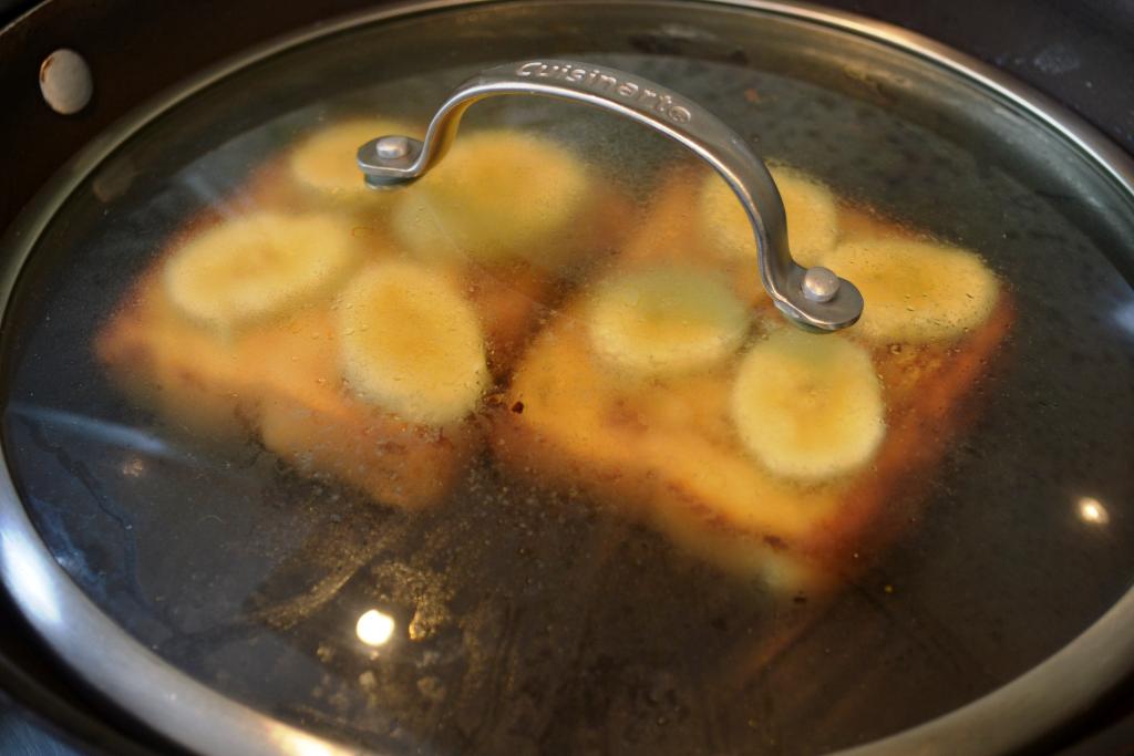 - Cuando el pan esté dorado en la parte inferior (4 minutos aproximadamente), deles vuelta y coloque las tajadas de banano en la parte superior.