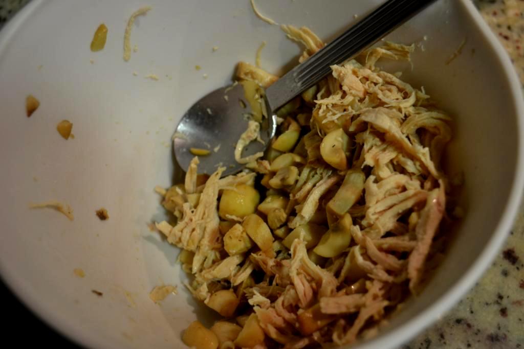 - Cocine la pechuga de pollo, deje enfriar y demenuce con la mano