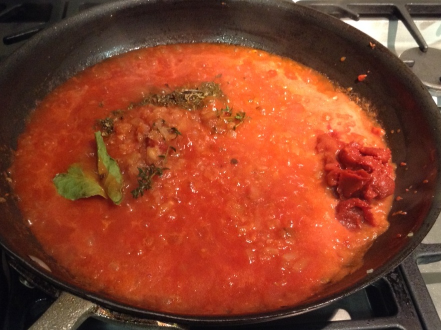 - Agregue el laurel, el tomillo, el orégano y la pasta de tomate.
