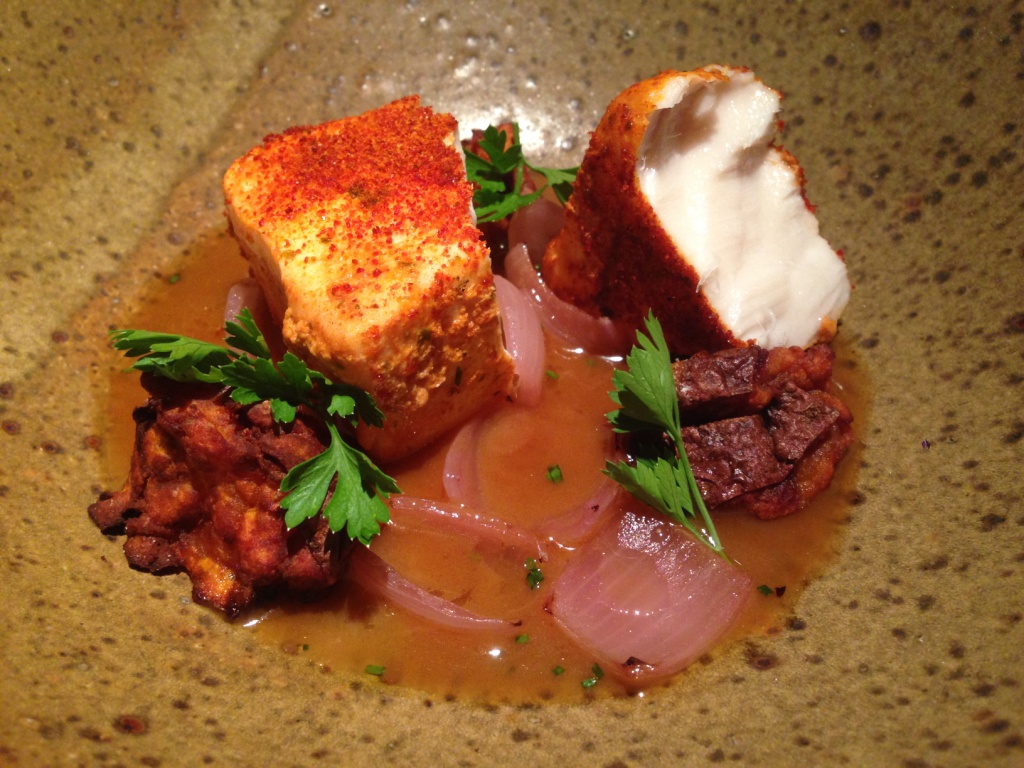 La entrada fue «Pulpo y lechuga de Mar: Yuyos frescos y ajíes ahumados«, un plato crocante y lleno sabores. El pulpo es uno de mis platos favoritos y esta preparación estaba excelente, realzando el sabor y complementandolo, sin esconderlo, con los demas elementos de la preparación.