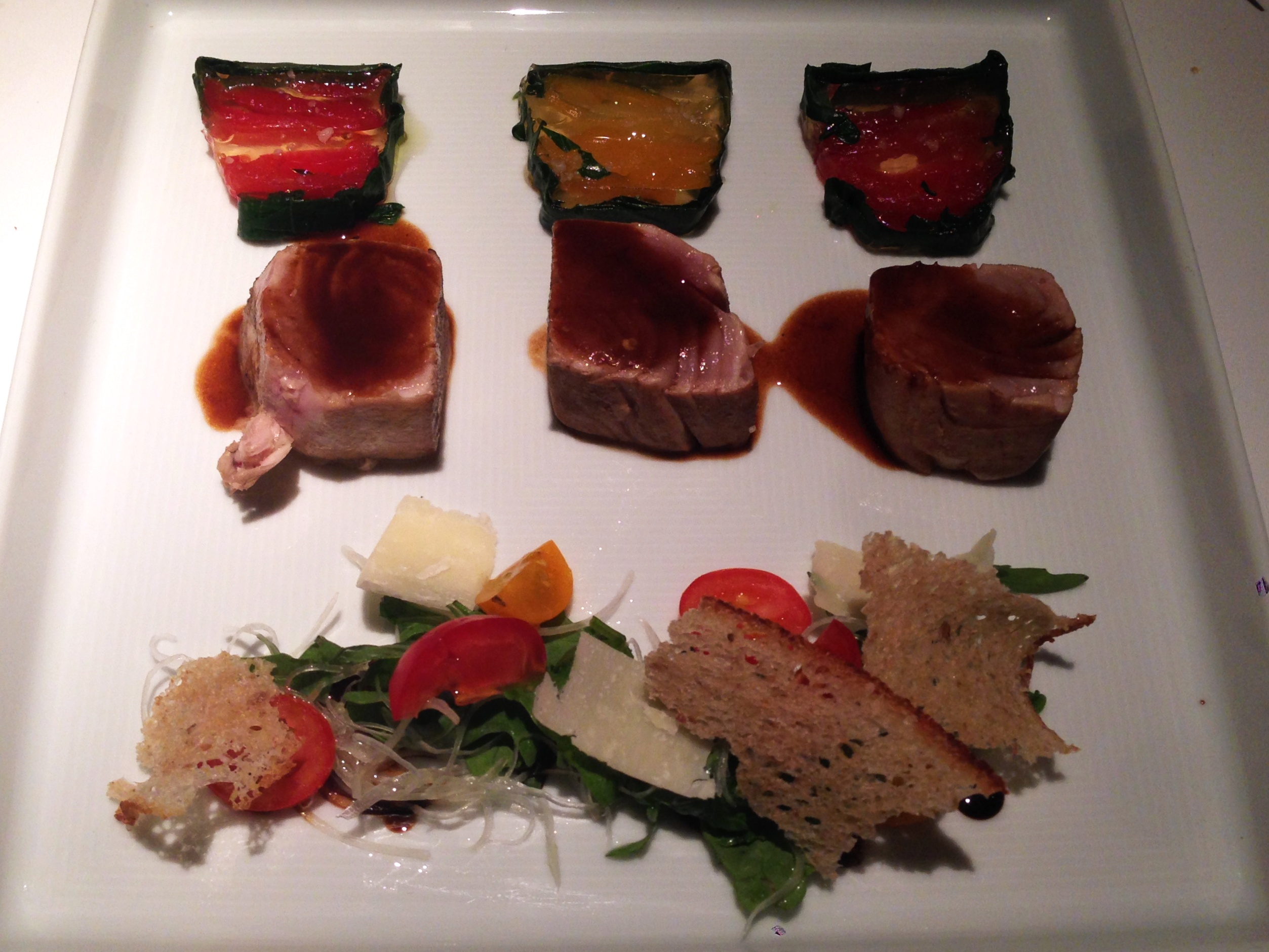 Uno de los platos fuertes «Lo bonito del bonito»: Bonito en sus jugos, tomates organicos y ensaladilla de parmesano y albaquilla«, la frescura del bonito, en su punto perfecto acompañado de unas gelatinas de tomates que contrastan y realzan el sabor.