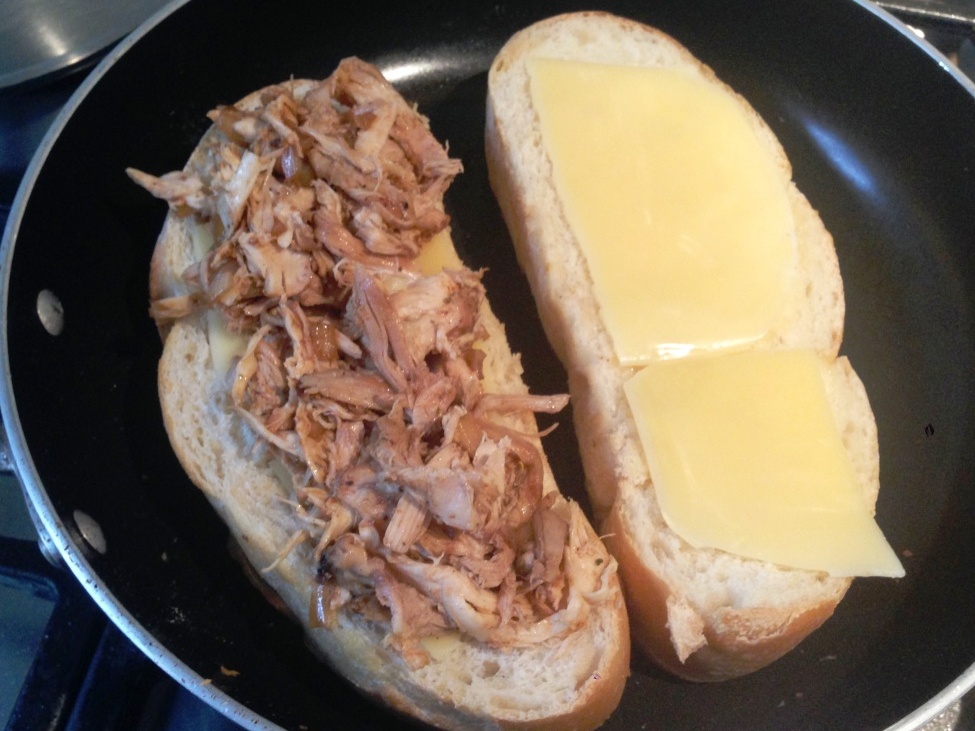 - Agregue abundante mezcla del pollo en una tajada y dos tajadas de queso en la otra.