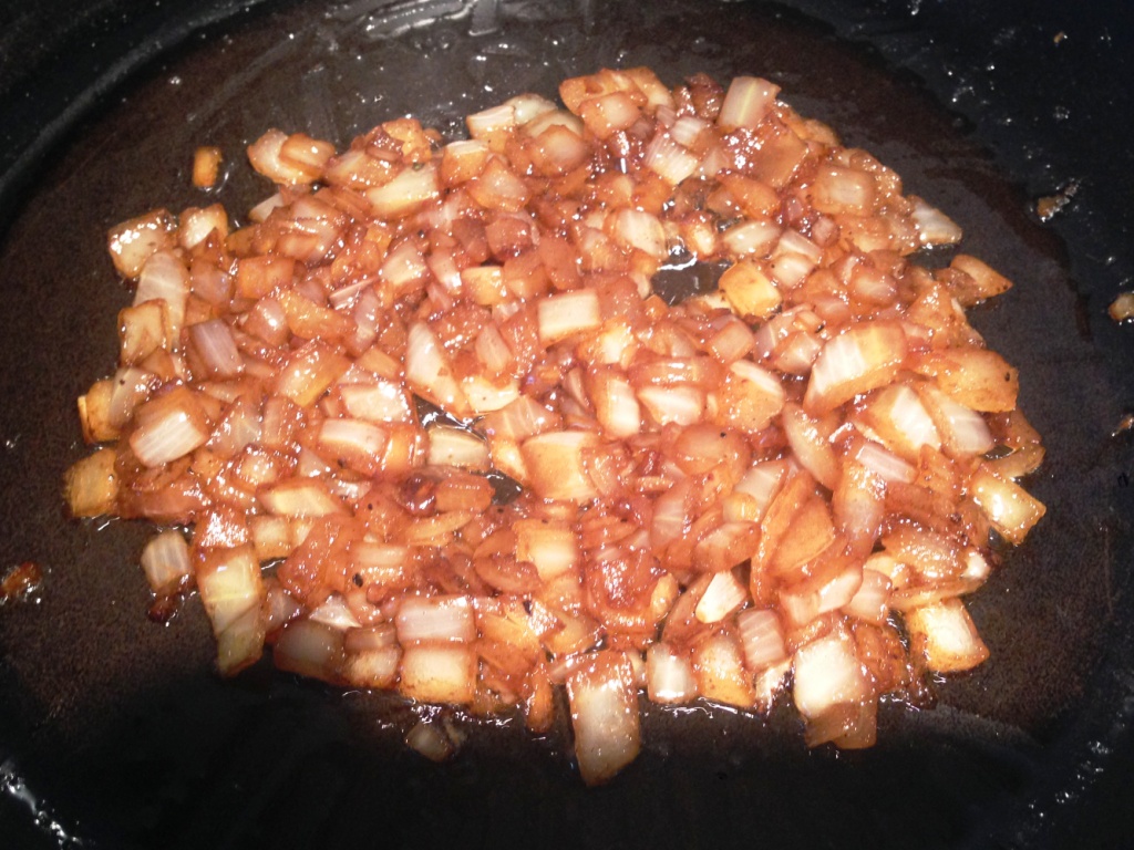 - Mientras se hornean los perniles, pique la cebolla y dórela en la sartén que reservó, cuando esté transparente agregue la salsa worcestershire y reserve.