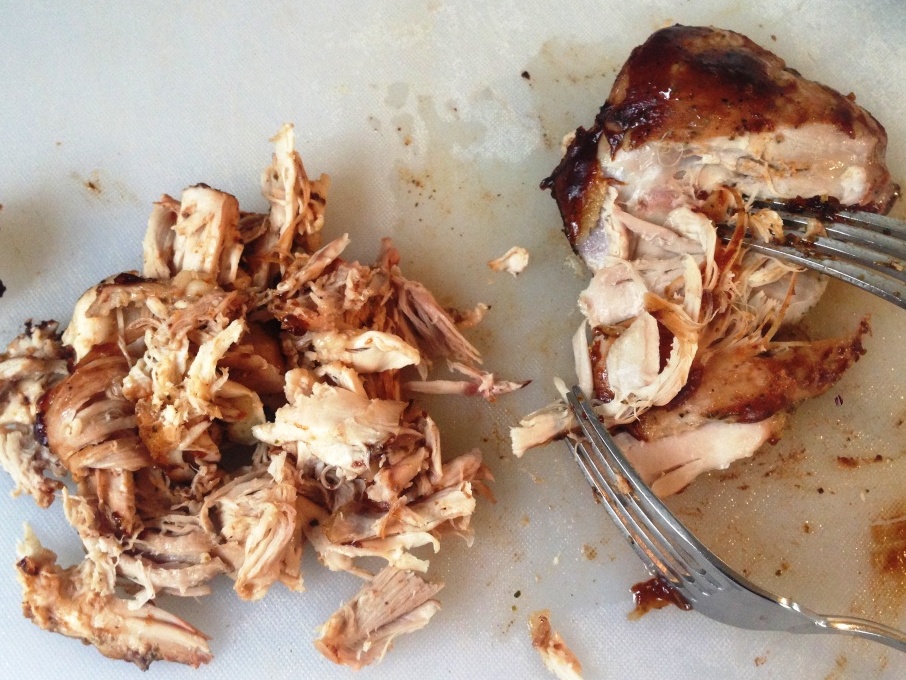 - Cuando los perniles estén listos, retírelos de la refractaria, retire el exceso de grasa y con la ayuda de dos tenedores “hale” tiras del pollo hasta que el hueso quede limpio.