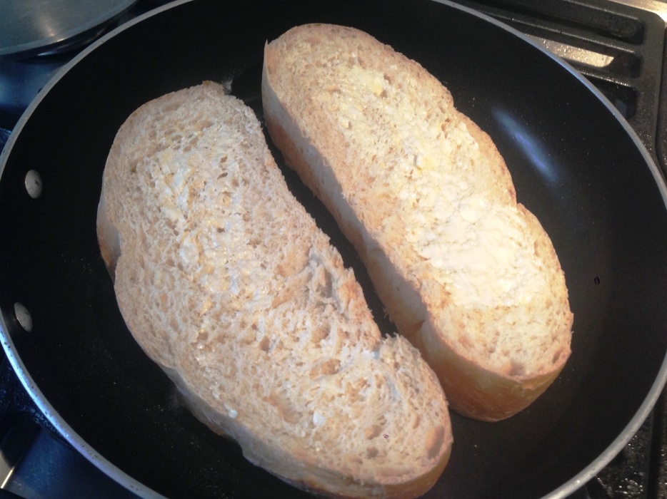 - En un sartén limpio ponga a calentar a fuego medio una cucharadita de aceite de oliva y coloque dos tajadas de pan en la sartén, a las cuales les ha untado previamente mantequilla