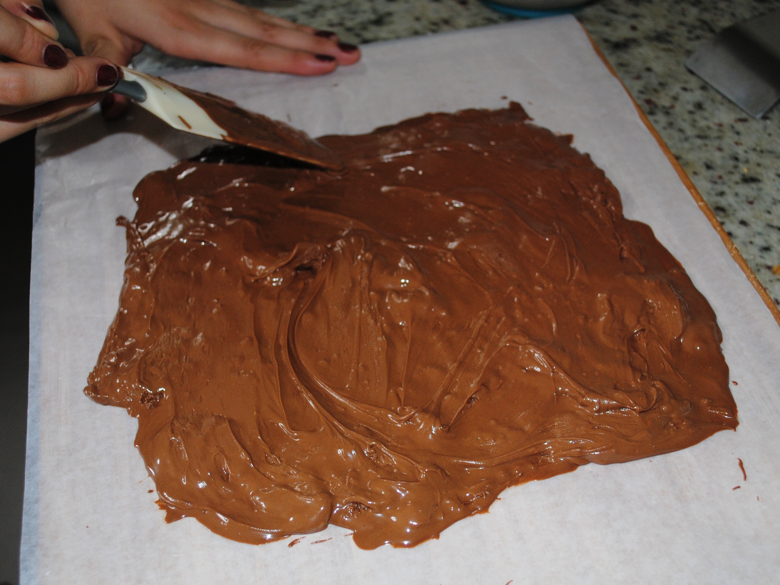 - Una vez esté derretido el chocolate, cubrir una bandeja con papel parafinado y esparcir sobre ella el chocolate con una espátula, intentando que quede más o menos del mismo grosor.