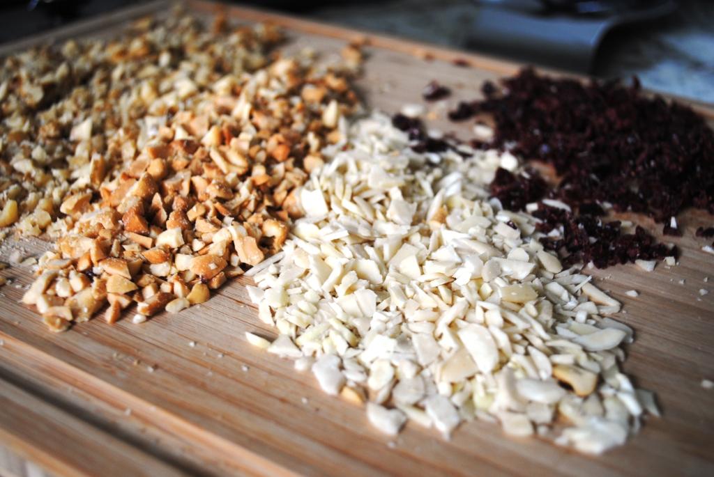 - Cortar las nueces y pasas de su preferencia en trozos. Nosotros usamos una mezcla de cashews, maní, nueces de macadamia, y cranberries secos.