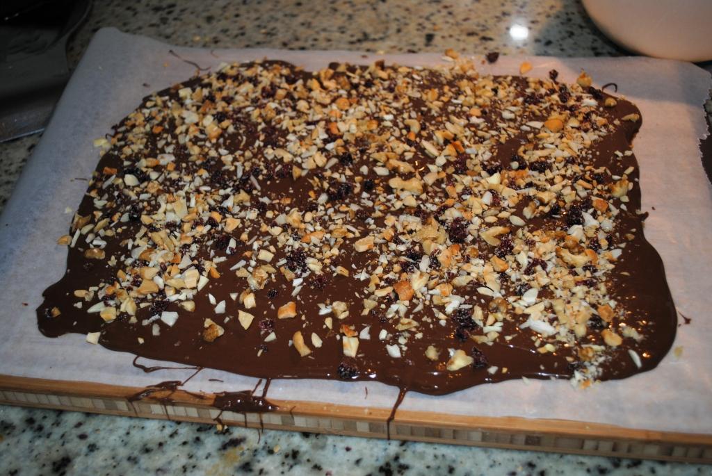 - Esparcir las nueces y pasas sobre el chocolate, presionandolas para asegurarse de que quedan bien incrustadas.