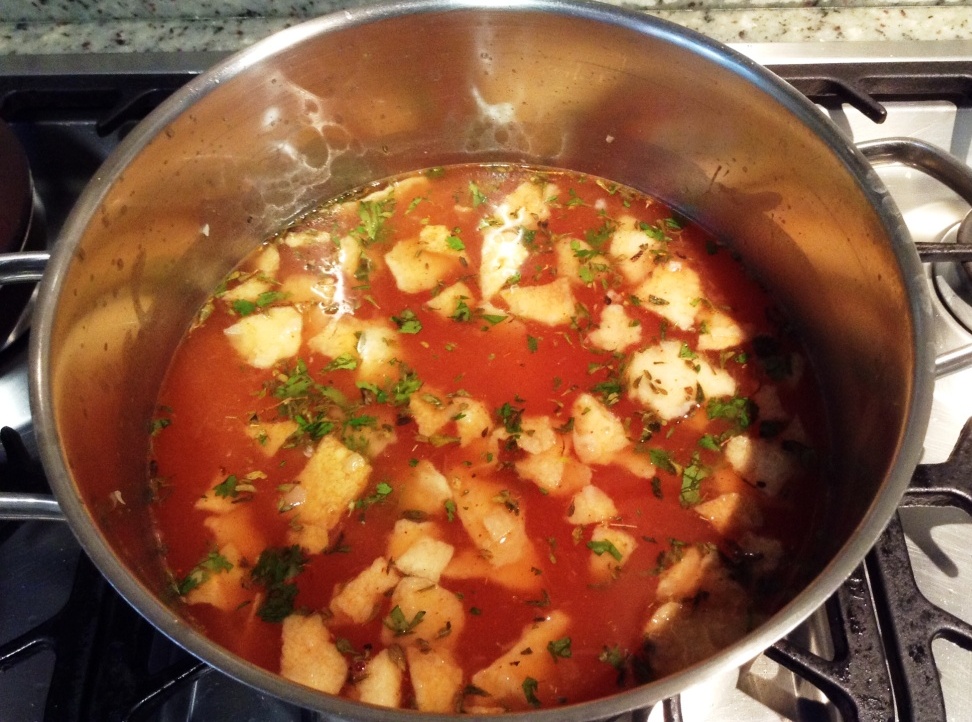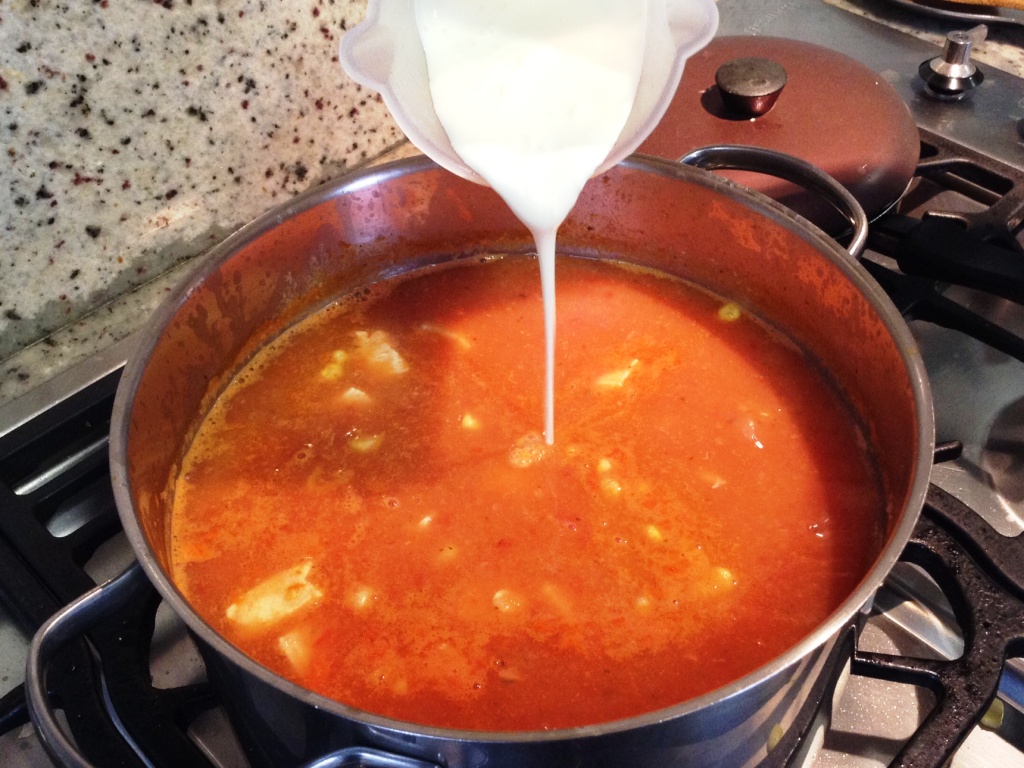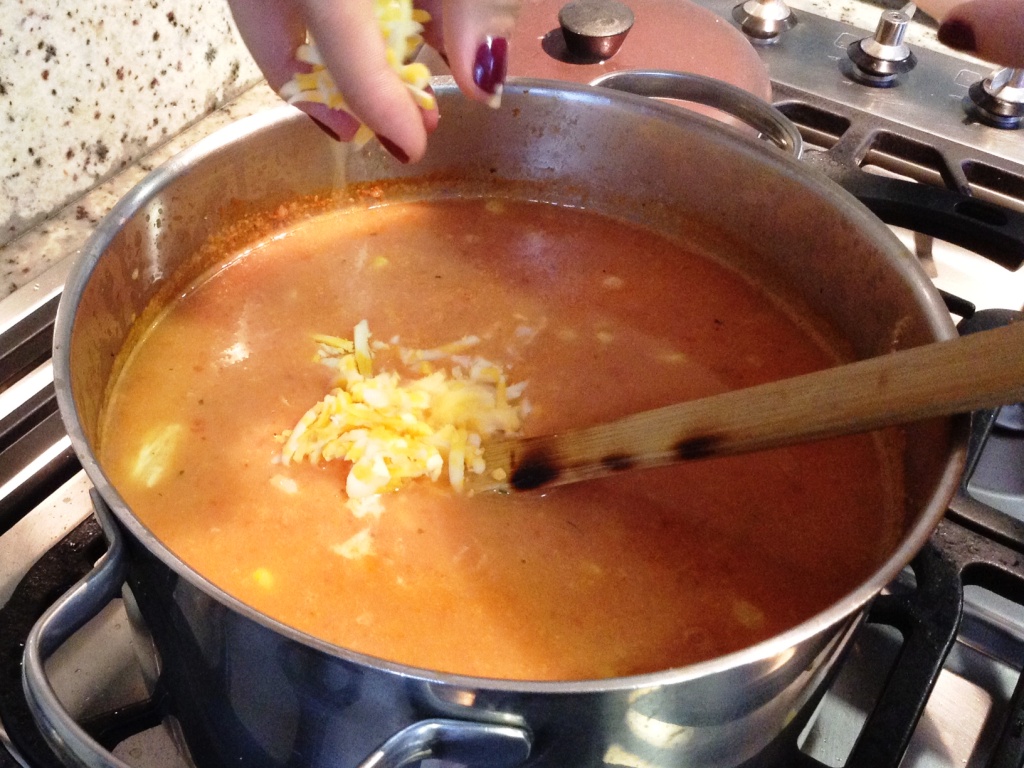 - Adicione el caldo de pollo, los tomates , especias y la salsa tabasco. Deje hervir por 5 minutos y retire del fuego.