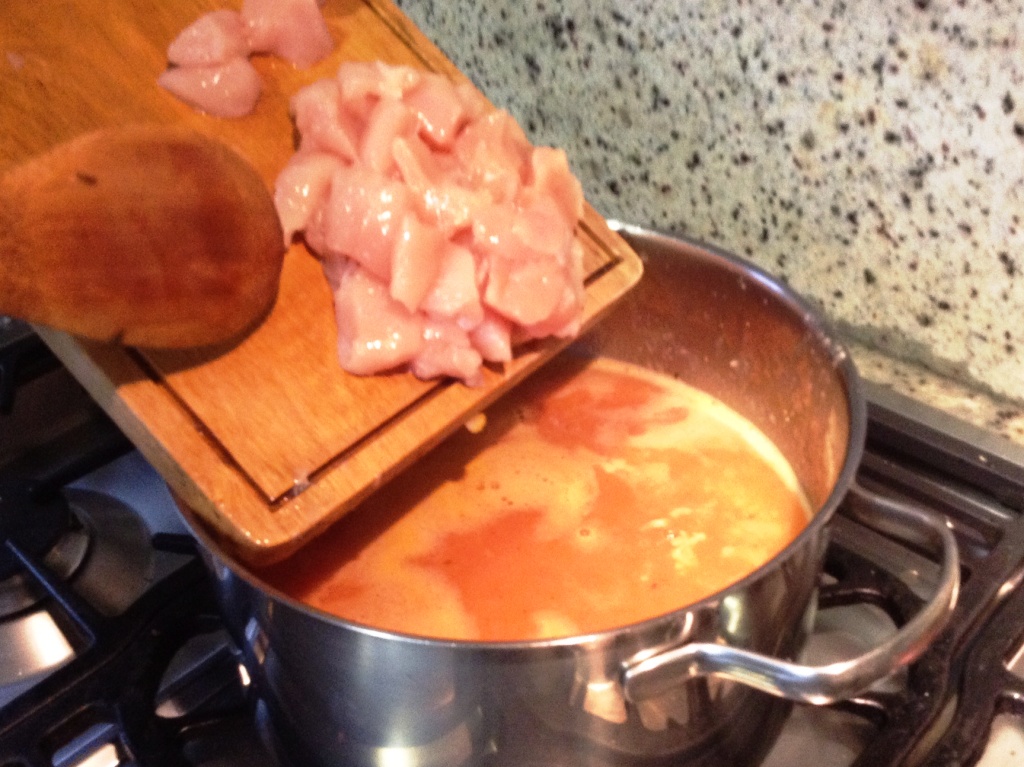 - Procese la sopa y coloque nuevamente a fuego medio alto. Adicione el pollo hasta que el pollo esté listo (7-10 minutos). Es muy importante que el pollo esté bien cocido, es peligroso para la salud consumir pollo que no esté bien cocinado.