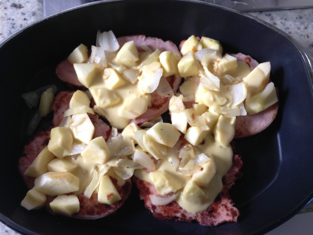 - Coloque las chuletas en una refractaria, esparza encima las cebollas, la manzana y la mezcla de mostaza.